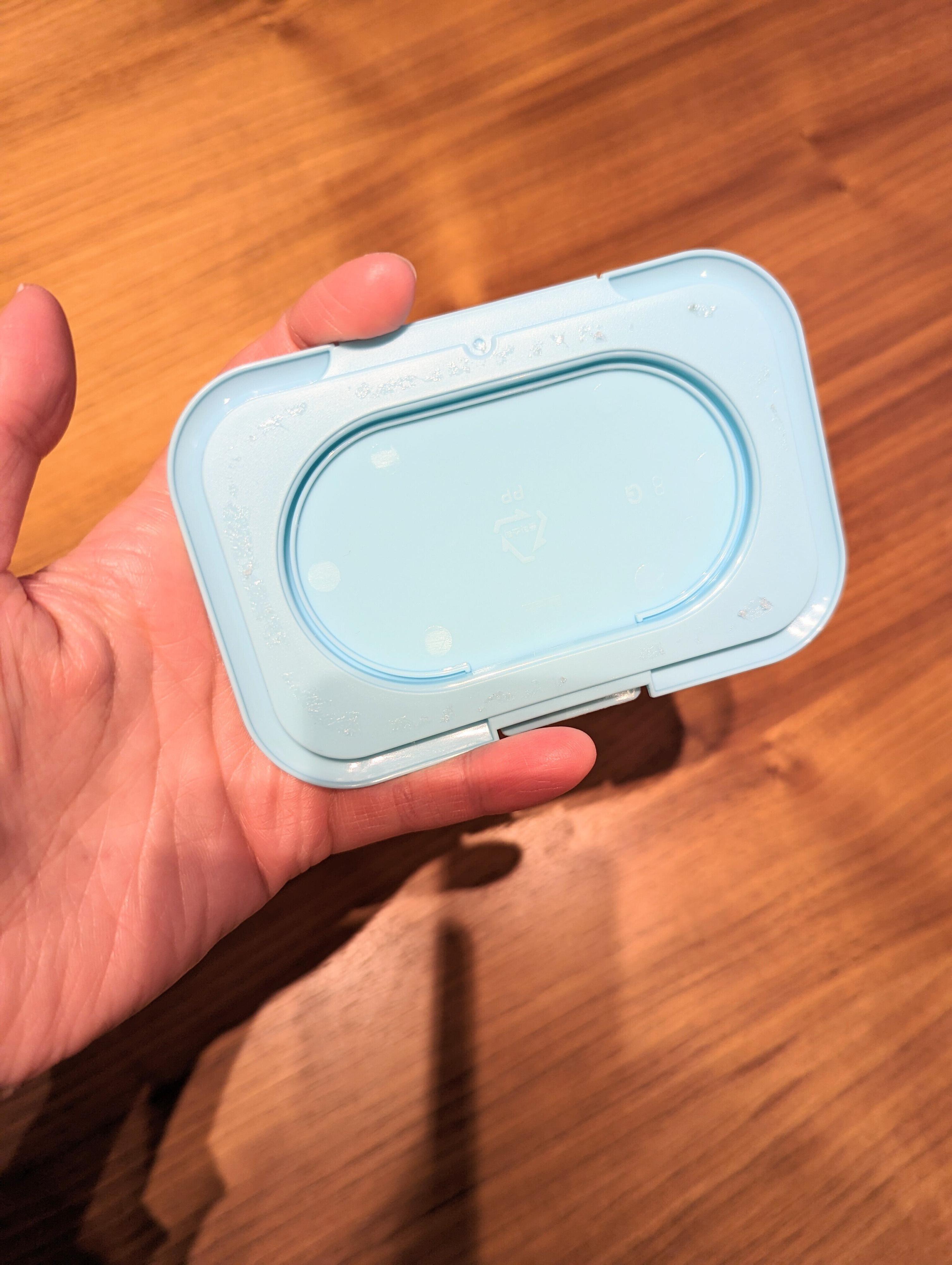 そこで、蓋をはがしてみたところ、まだまだ粘着力があることが分かりました。これは…よく100均で売っている、ウェットティッシュの蓋として使えるんじゃないか?と思い、やってみました。
