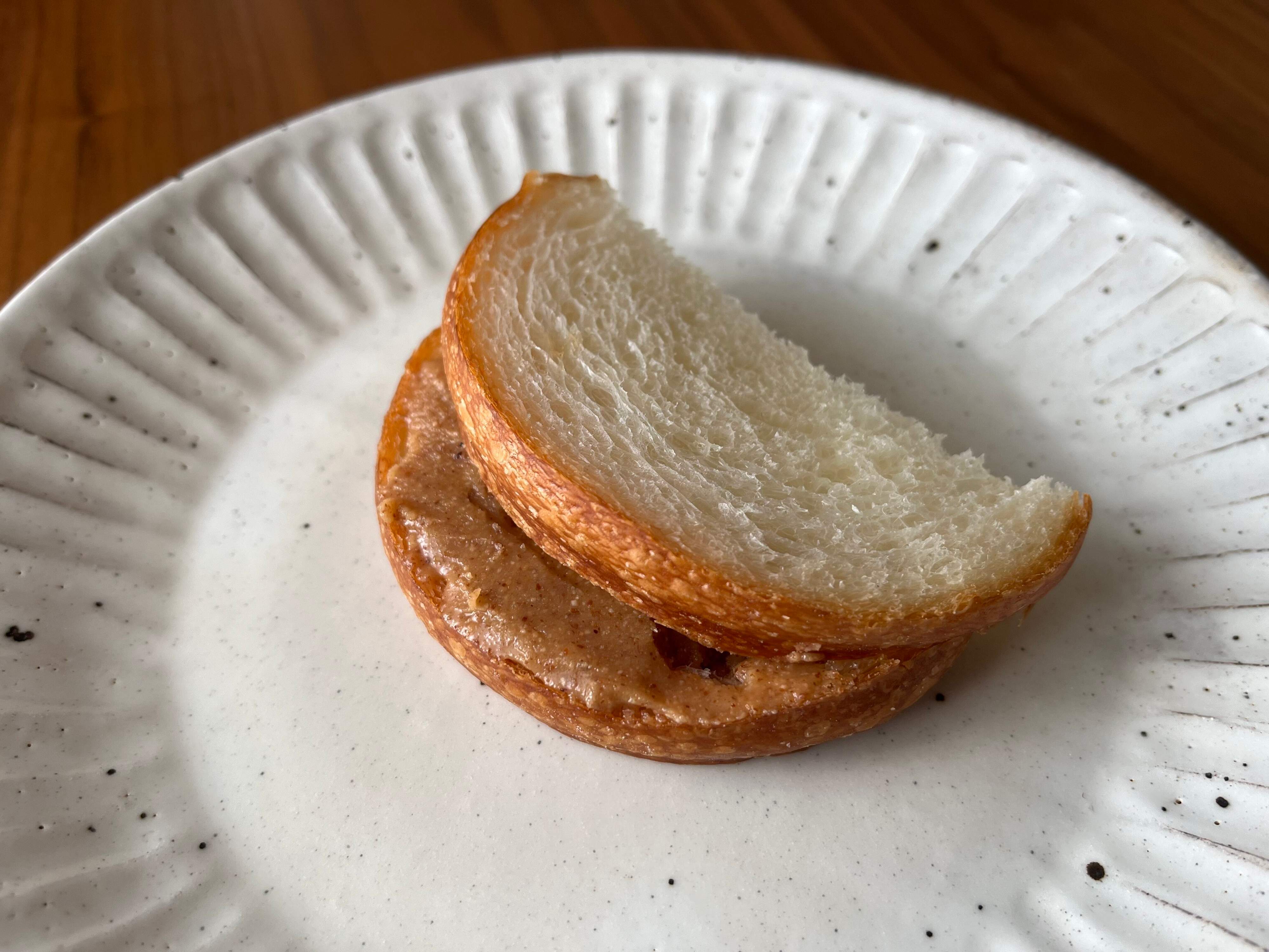 マーガリン程度の硬さなので、ベーグルなどハードなパンにはそのまま塗れますが、食パンなどの柔らかいパンに載せるときは、焼きたてのパンにすくったかたまりを載せて、柔らかくしてから塗り広げるのがおすすめです。