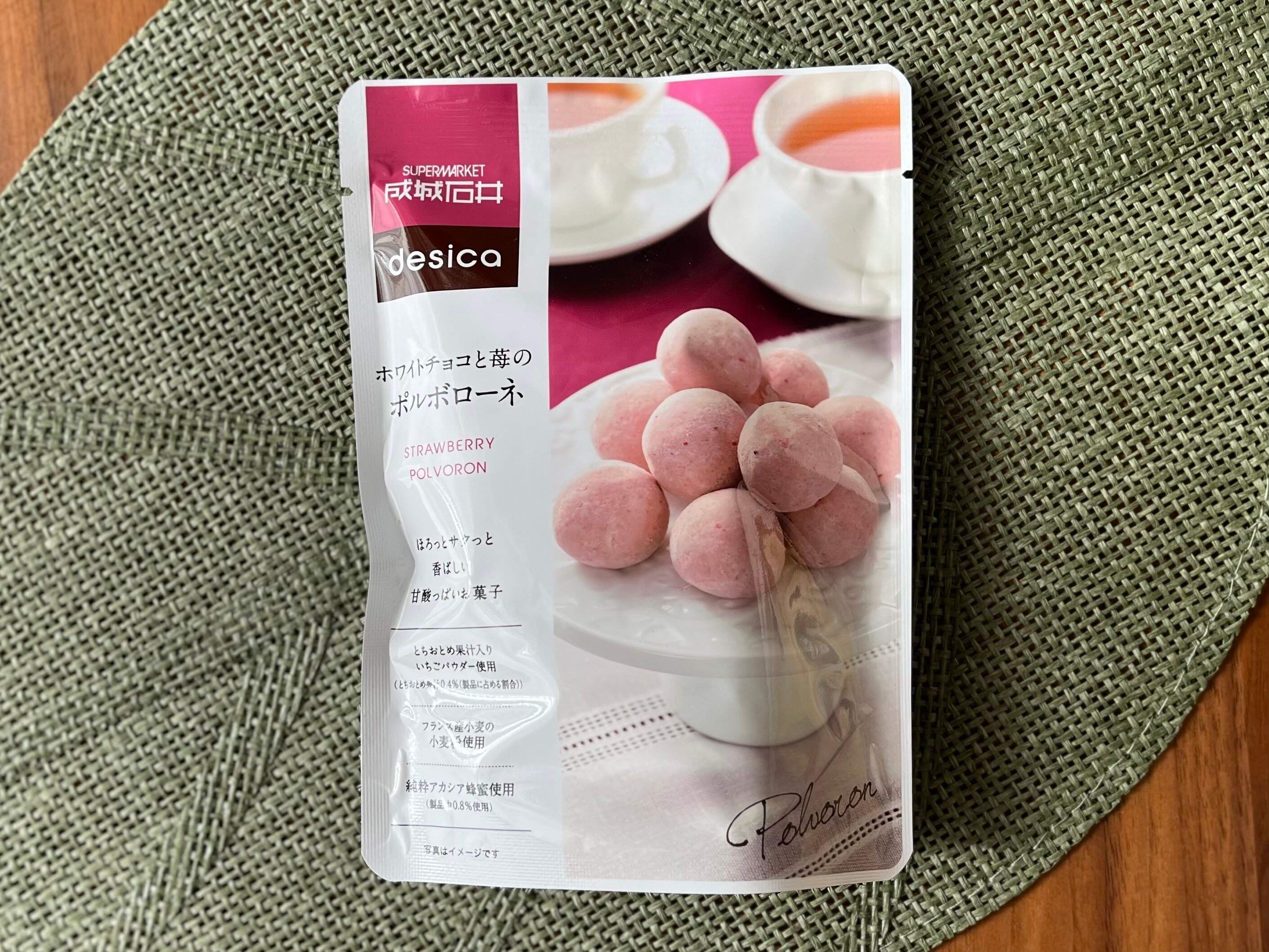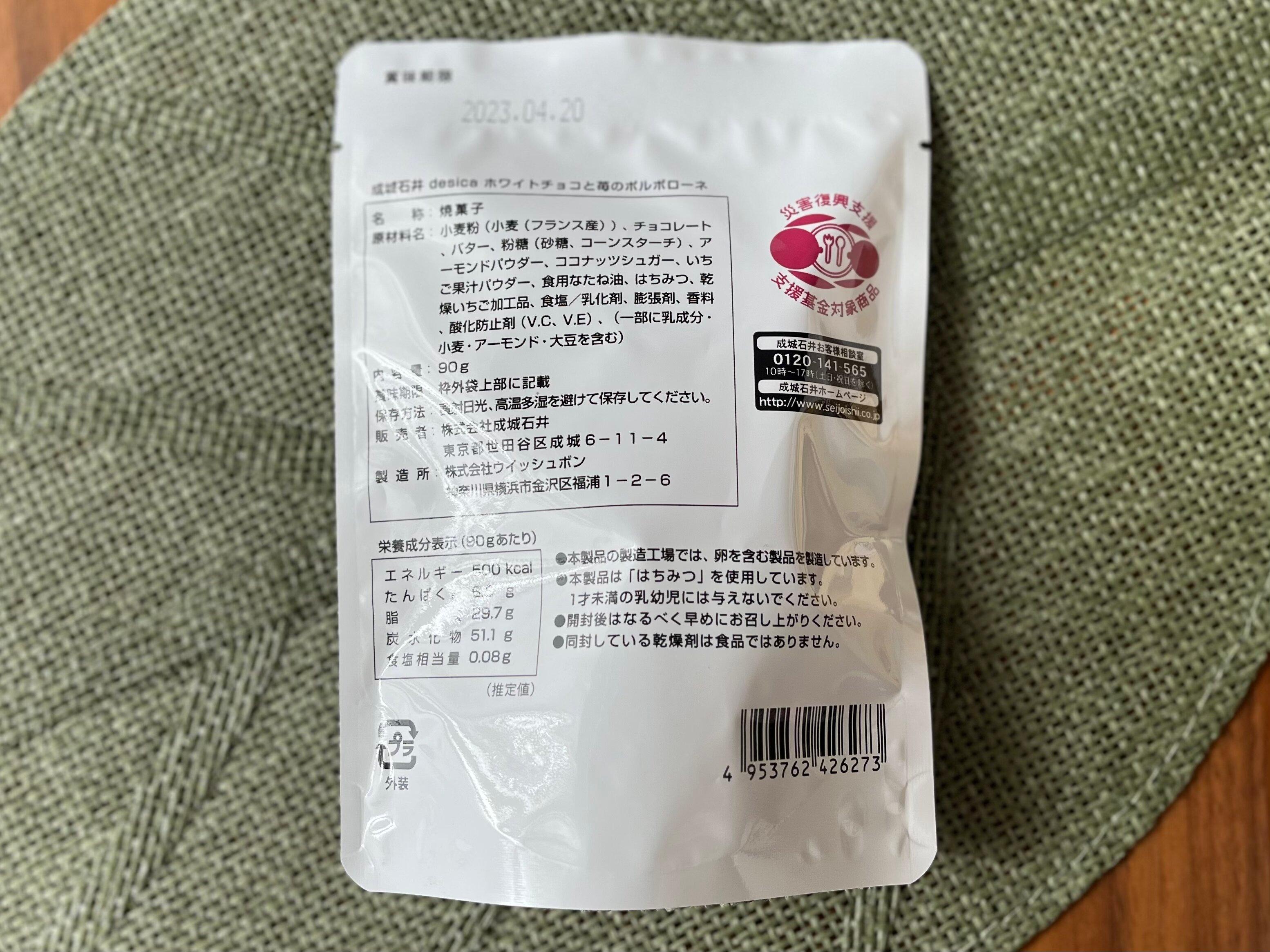 成城石井のこだわりシリーズ「desica」の一品、「ホワイトチョコと苺のポルボローネ」。90g入りで530円です。