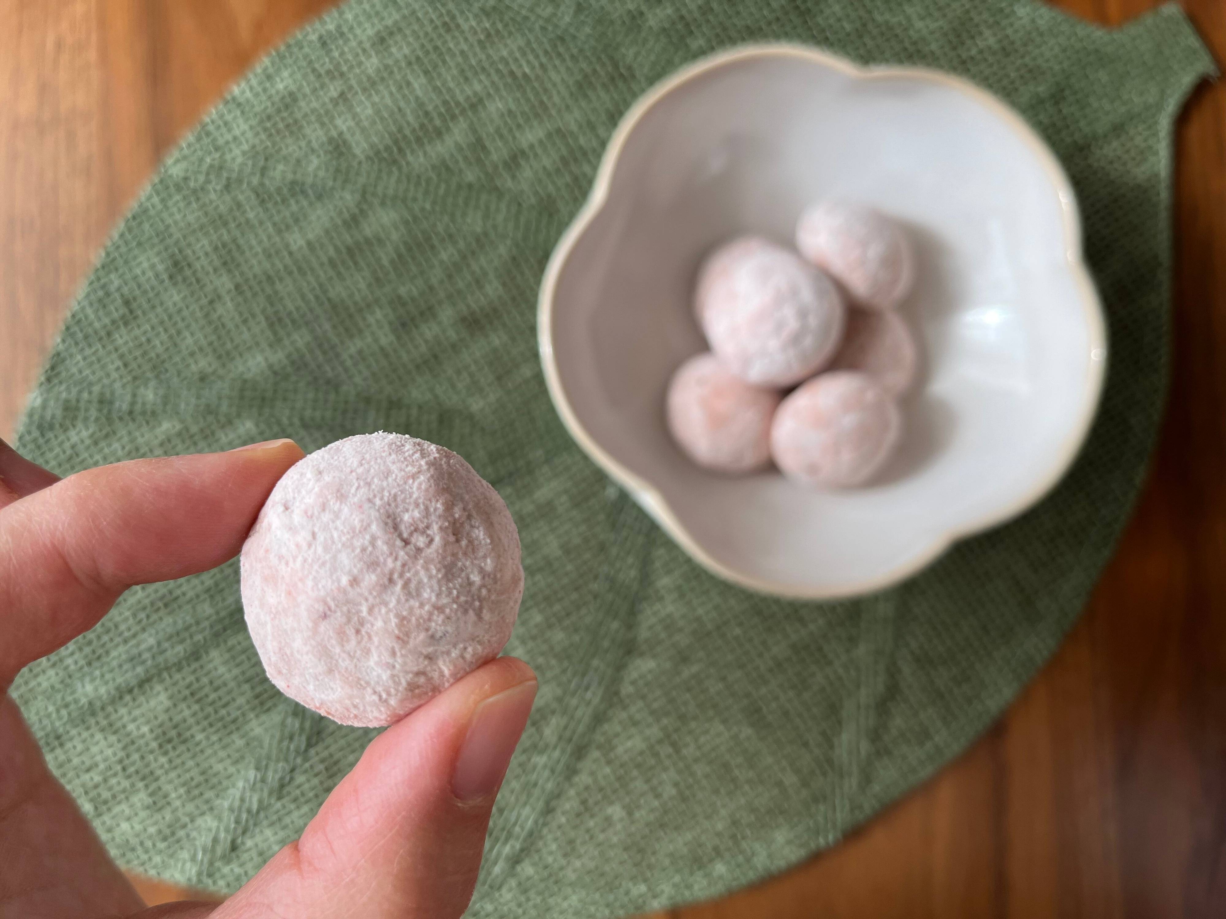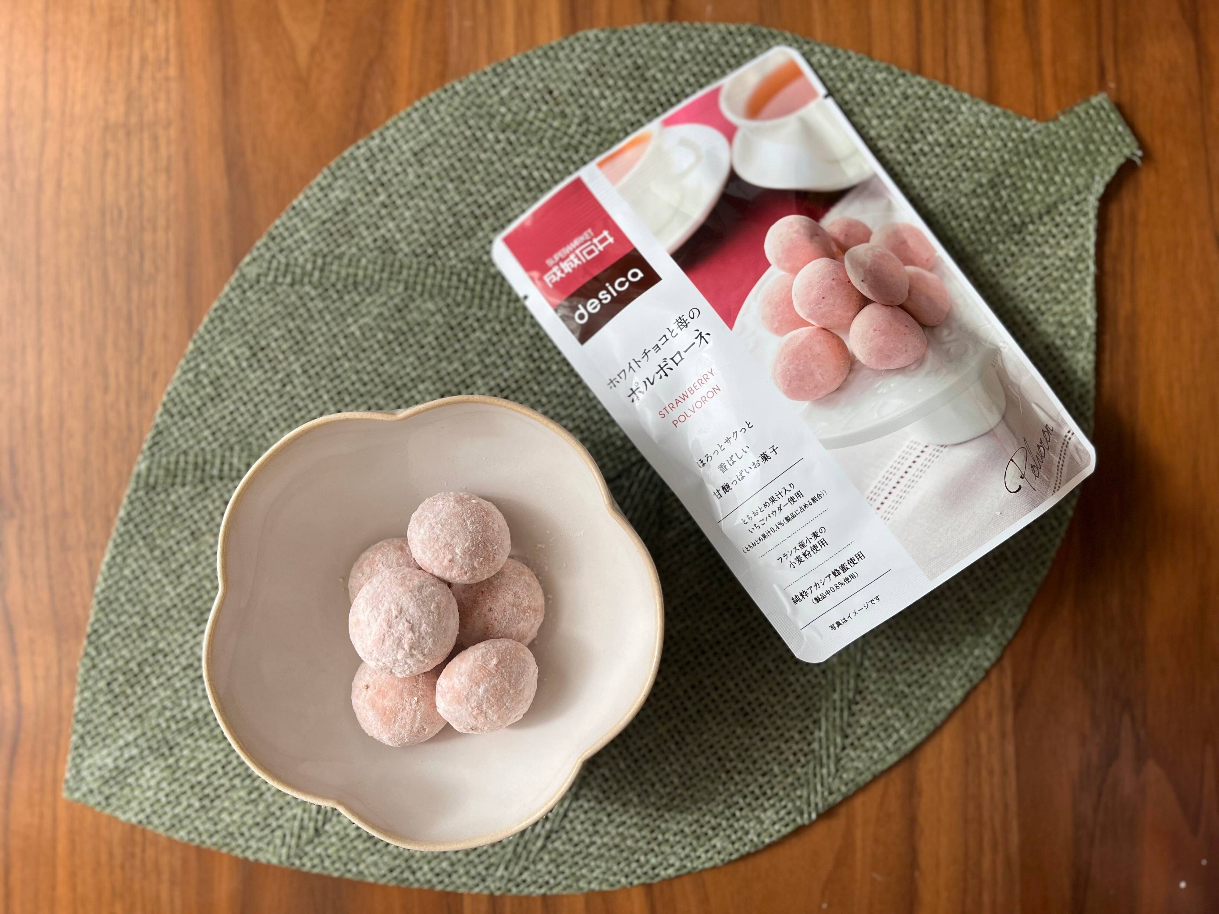 「ポルボローネ」はスペイン発祥の焼き菓子で、ほろほろと口の中で溶けていく食感が特徴的。こちらの商品は、そのポルボローネを、さらにホワイトチョコで包み、いちごパウダーをまぶすという贅沢な仕様。