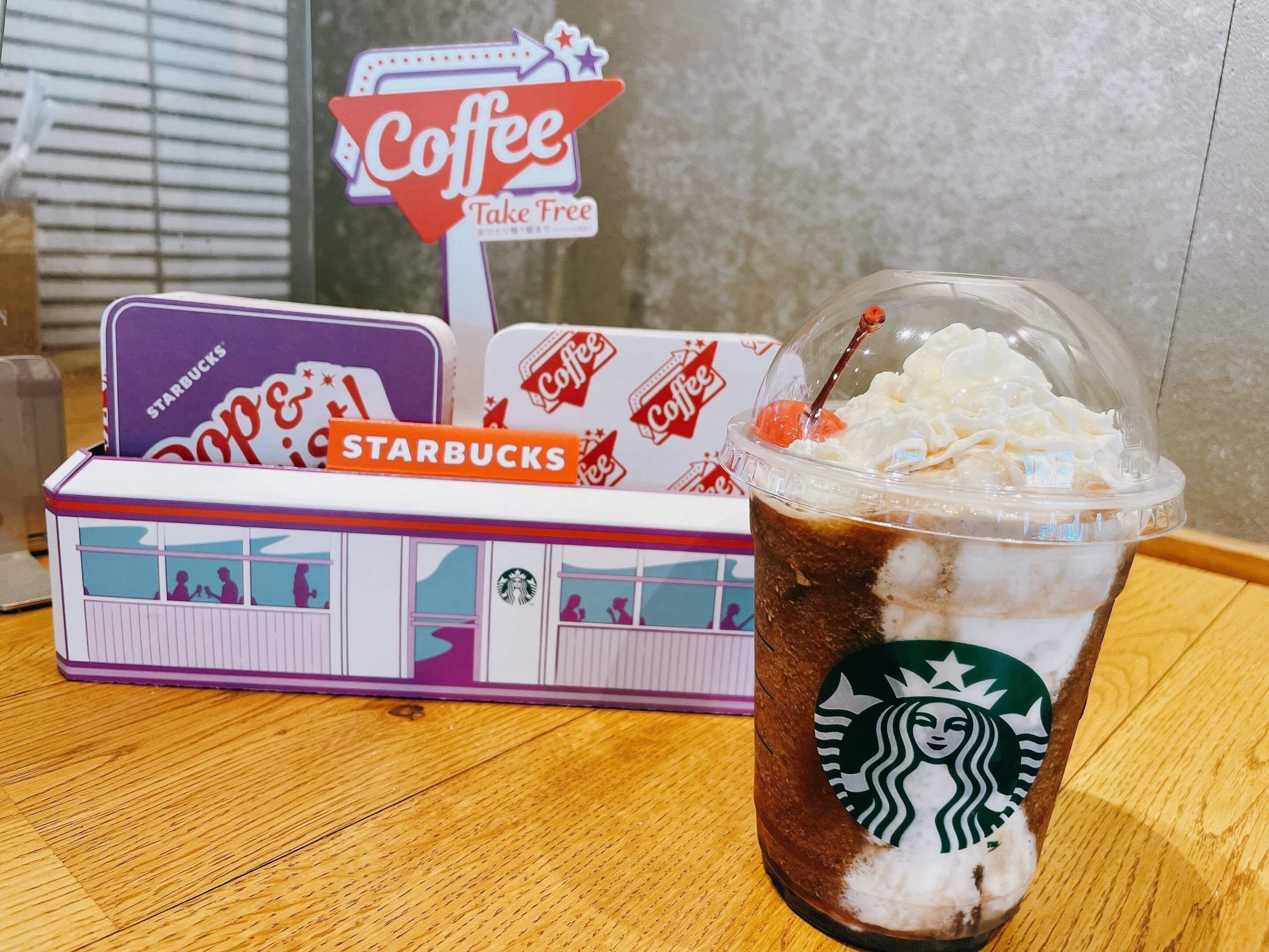 3月15日水曜日からレトロアメリカンでポップなコーヒー体験を、という初めましてなテーマで新しいドリンクやフードが発売されました。