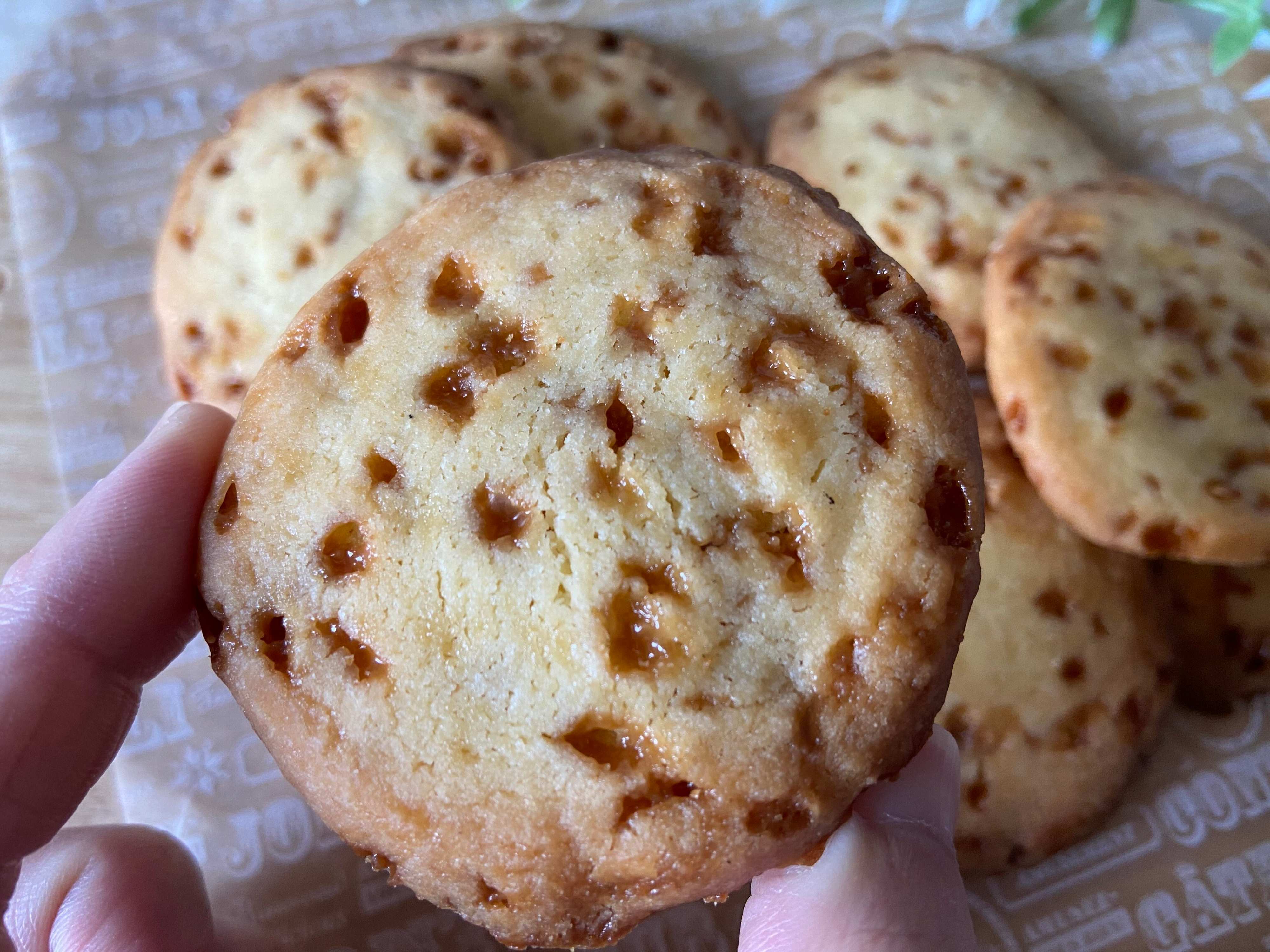 原材料もシンプルで、小麦粉、バター、砂糖、卵に塩キャラメルの粒がたっぷりと練り込まれて香ばしく焼き上げられています。