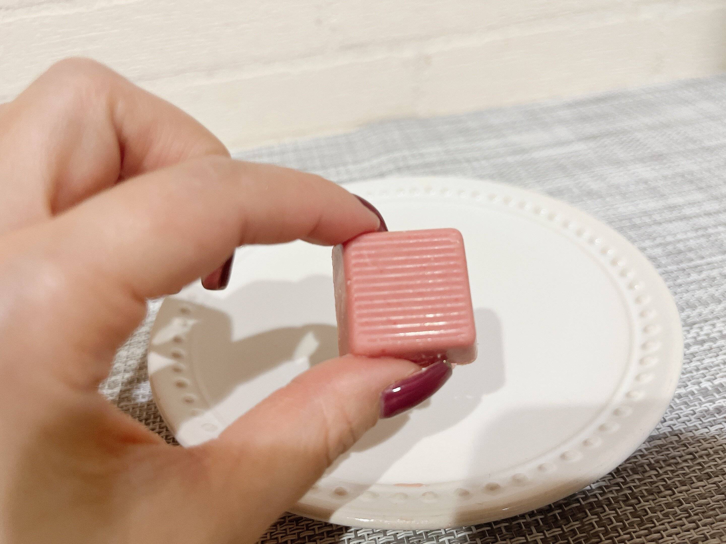 袋を開け、表側だけ見ると、一見キューブ型のいちごチョコですが裏側を見てみると柿の種がぎっしり詰まっているのが分かります。