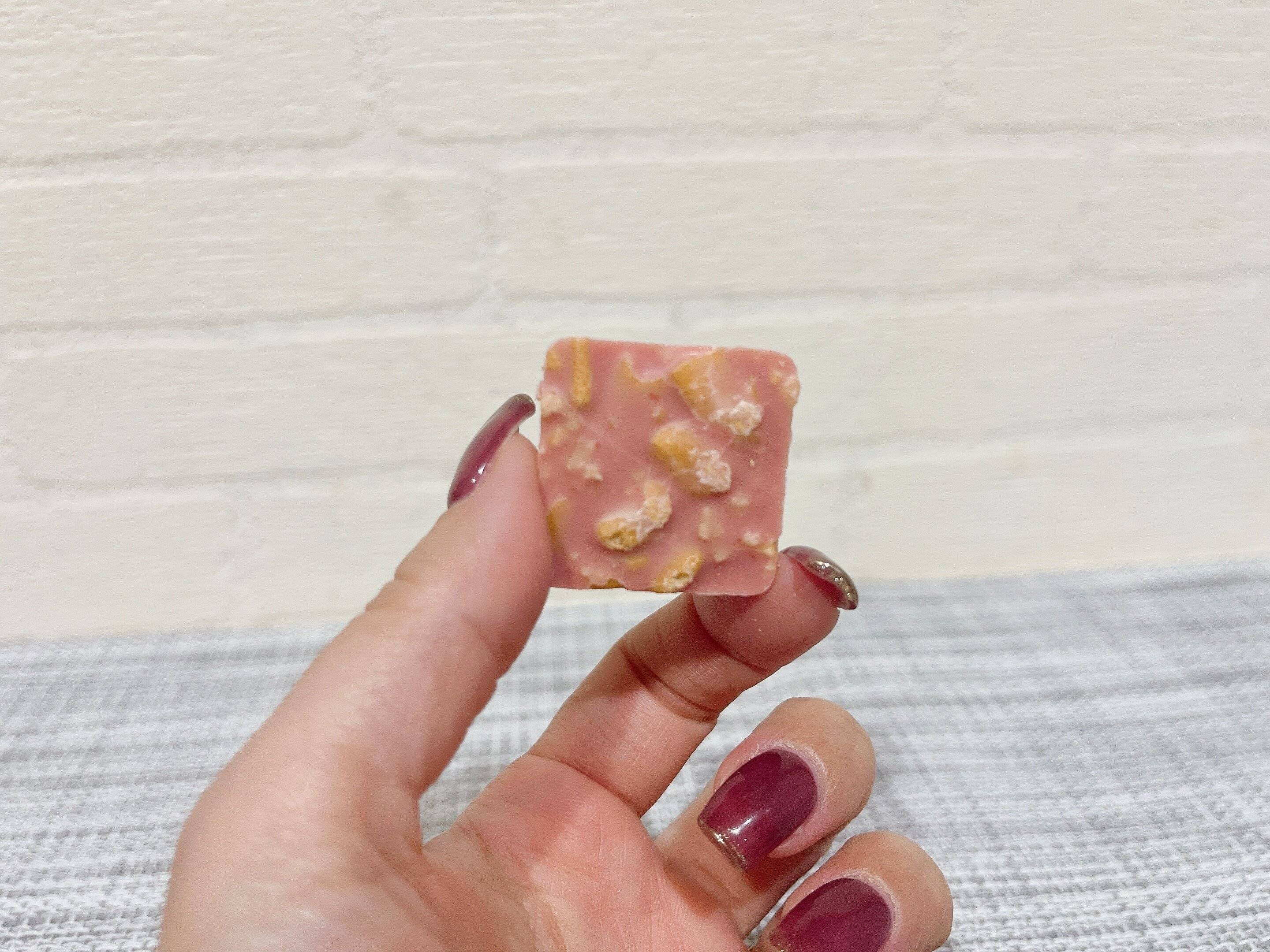 一口食べると、柿の種のザクザク感がかなり主張しています。そのあとにいちごチョコの甘さが感じられ、甘じょっぱさが絶妙においしい~!