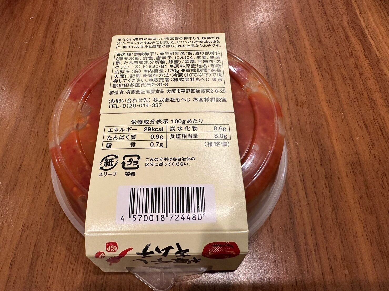 カルディの冷蔵コーナーで思わず美味しそう!とすぐにカゴに入れた南高梅の梅干しを特製ヤンニョムでキムチにしたと言う「もへじ」の梅干しキムチ。