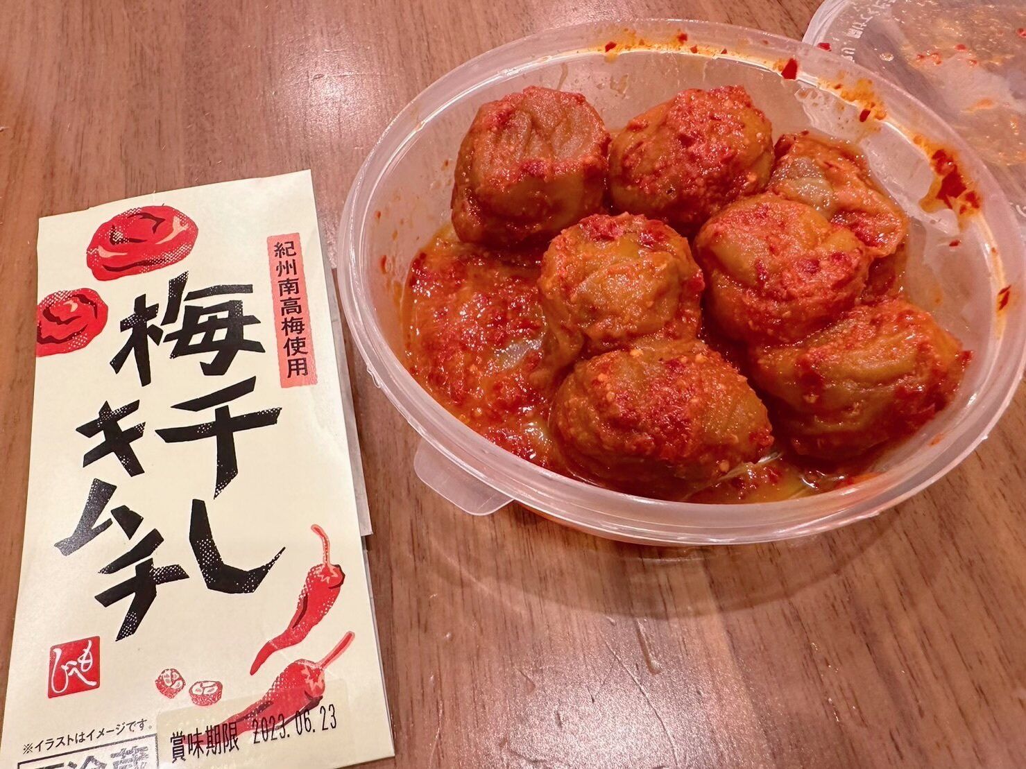 はちみつが効いた甘酸っぱい梅干しと、ヤンニョンで漬けた甘辛キムチがめちゃくちゃに合う!甘酸っぱ辛い、梅干しとキムチの両方のいいところが合わさり旨味があふれています。