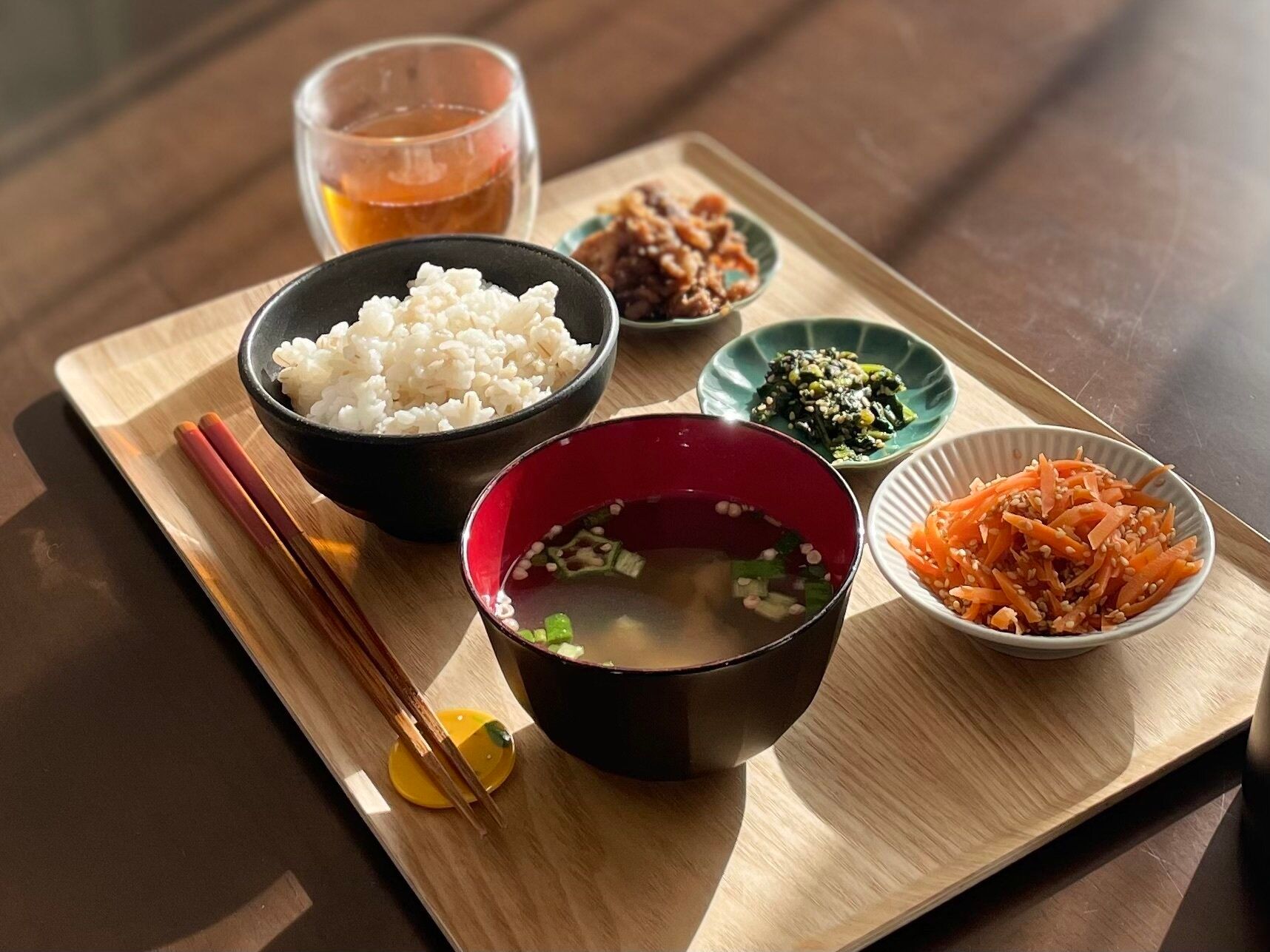 木目がおしゃれなこのトレイは、朝ごはんやランチタイムにも1人1枚を使ってさっと並べることができます。
