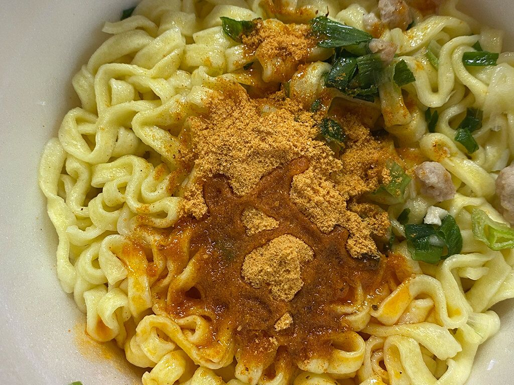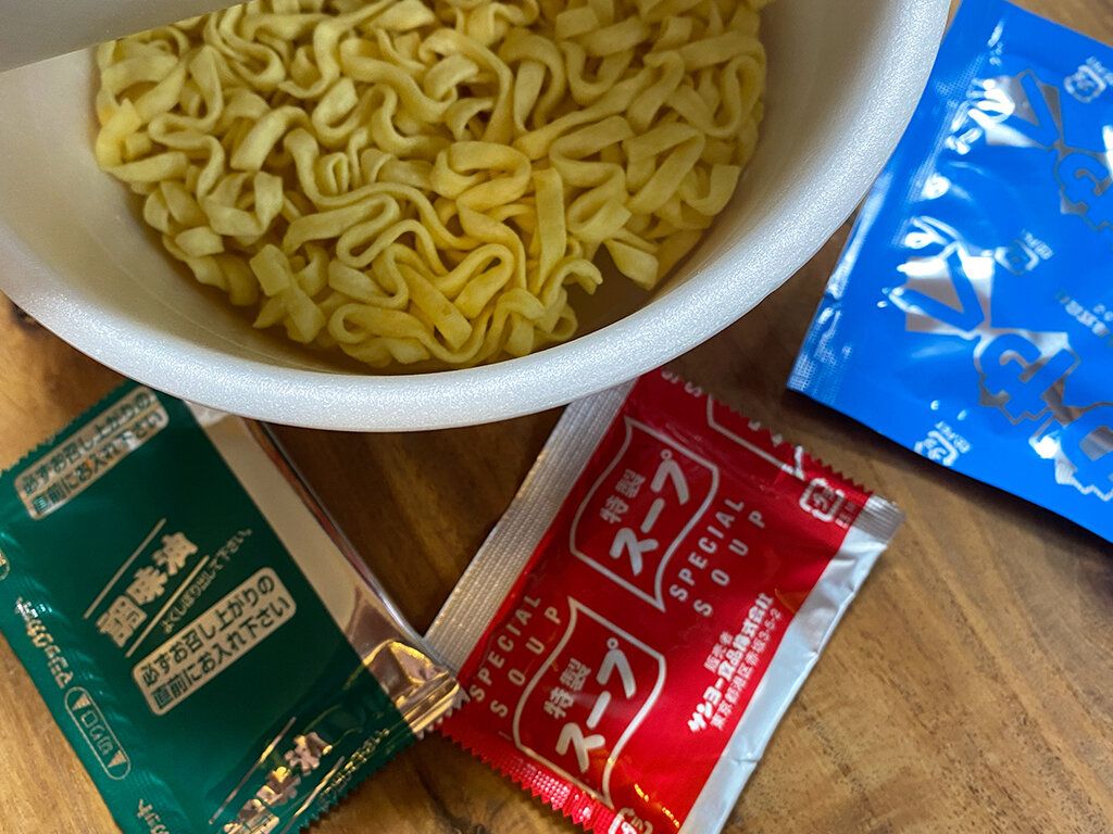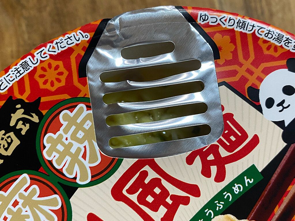 汁なしのカップ麺なので、まずかやくを麺の上にあけてお湯を入れてから4分待ちます。