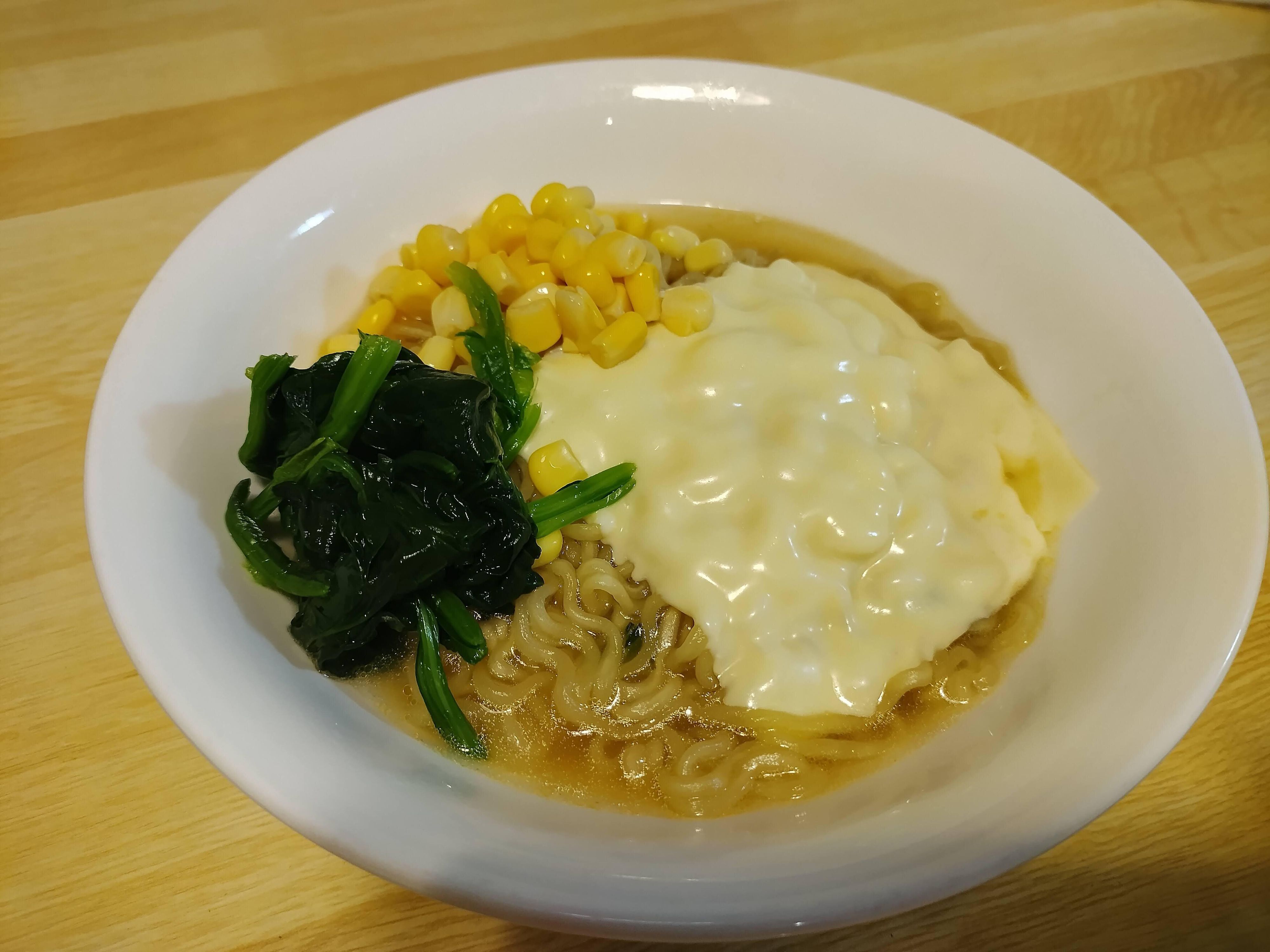 今回はほうれん草、コーン、スライスチーズをトッピングしてみました。トッピングは基本的に好きなものを乗せましょう。韓国ではキムチをトッピングしている人も多いですね。