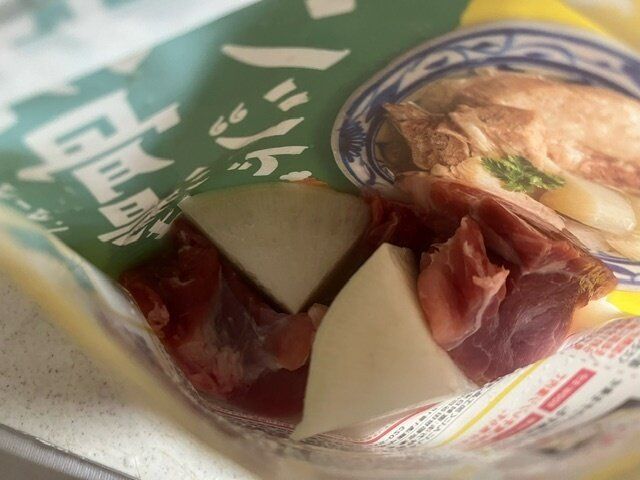 袋には汁が入っていて、大根と豚肉を入れます。そして水50mlをたしたら