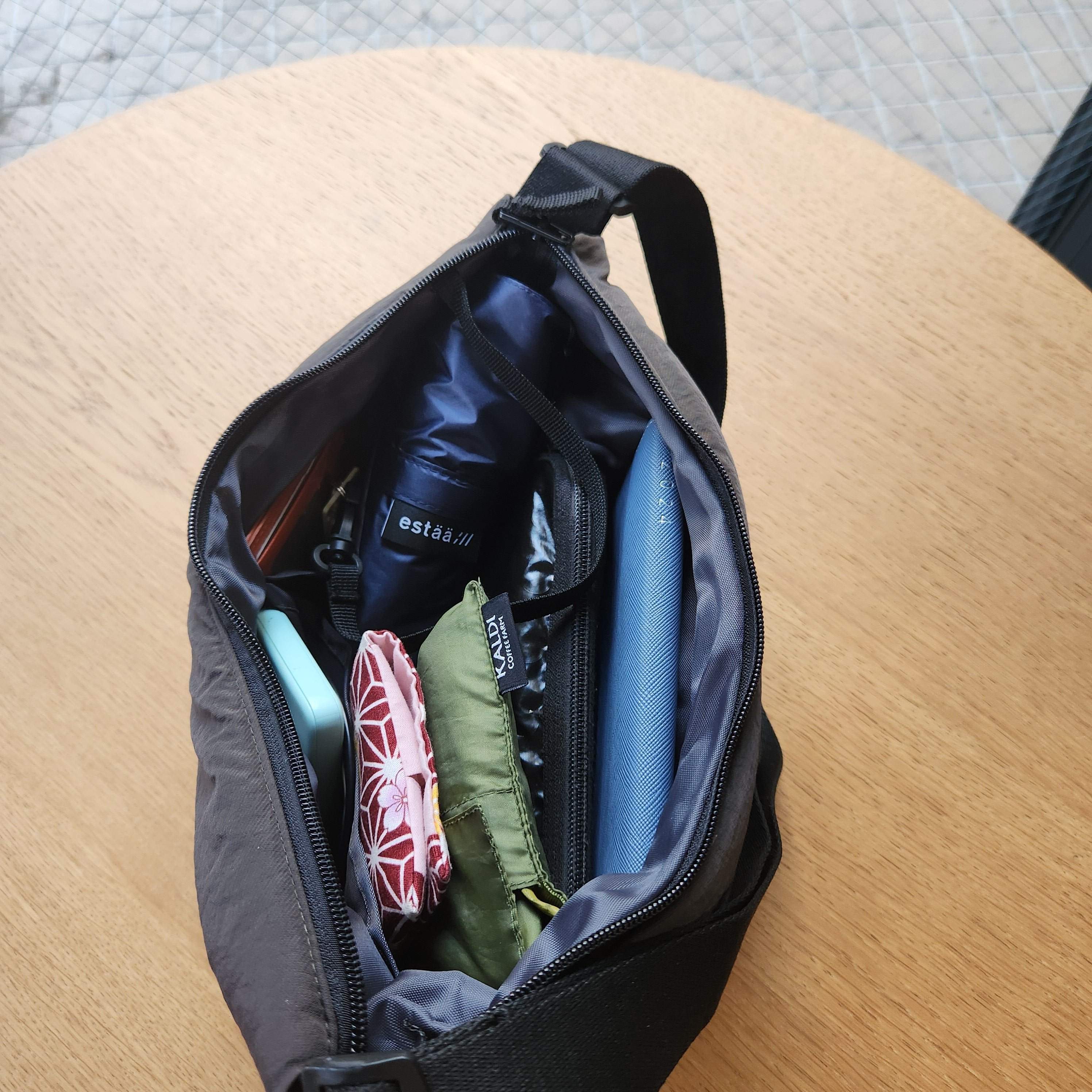 そしてこのクロスボディバッグのもう一つのおすすめポイントが容量です。写真のように、B6サイズの手帳、長財布、エコバッグ、折り畳み傘、ティッシュ&ハンカチ、モバイルバッテリーと持ち歩きたいものがしっかりと入ります。