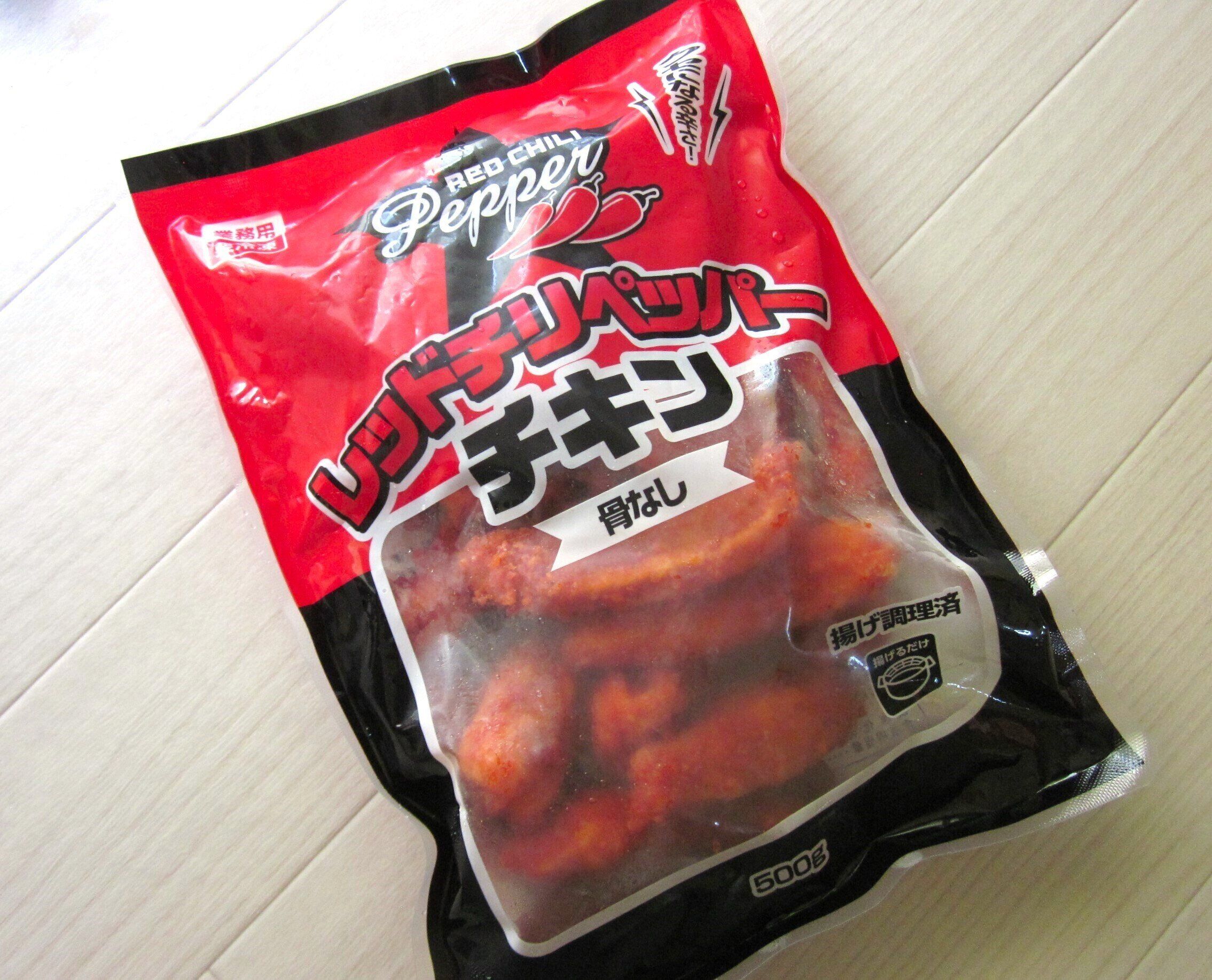 まず1つ目は業務スーパーの定番「レッドチリペッパーチキン」。唐揚げコーナーにある冷凍食品で、500g入り570円(2024年7月購入時)です。