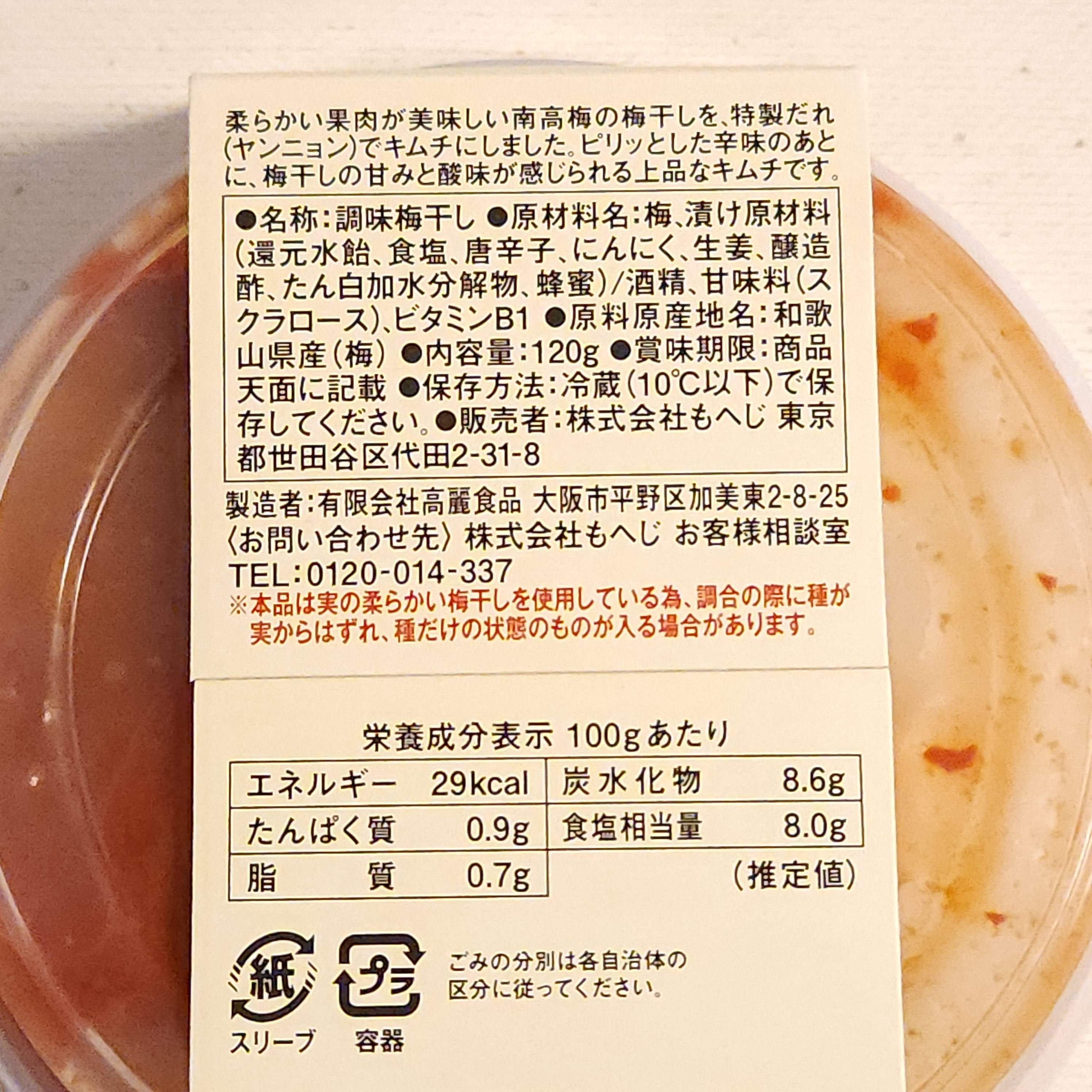 裏面に記載のように、南高梅の梅干しが特製だれ(ヤンニョン)に漬けられキムチになっています。