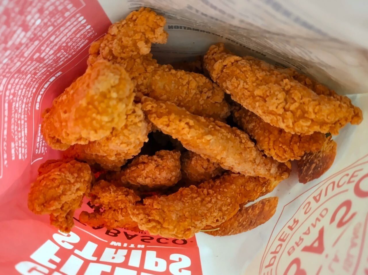 衣は程よい厚みで、細長い形をしているので、衣のサクサク感をしっかり味わうことができます。タバスコの特有の酸味は思ったよりも強くはありませんが、ビールに合いそうなチキンです。冷めてもおいしいので、お弁当にもおすすめですよ。