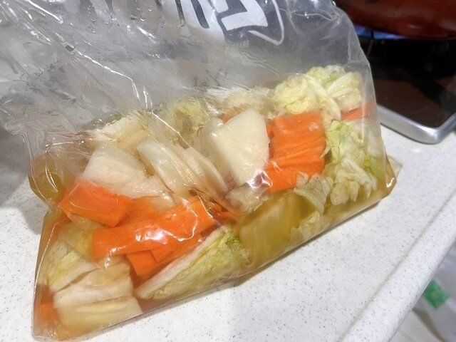 今回は白菜に加え、家にあったにんじんと大根も一緒に漬けました。わが家は6人家族なので一気に2袋全部使い白菜も大量に消費しました。できあがったのでさっそく食べてみます。