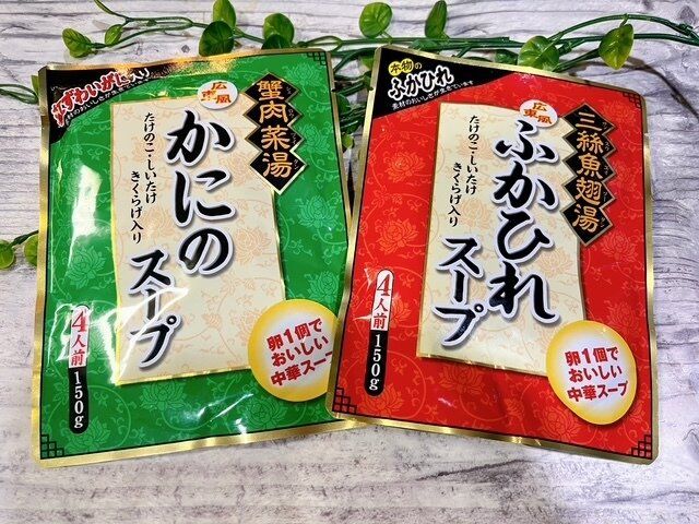 こちらです。「かにのスープ」「ふかひれスープ」150g 4人前 228円