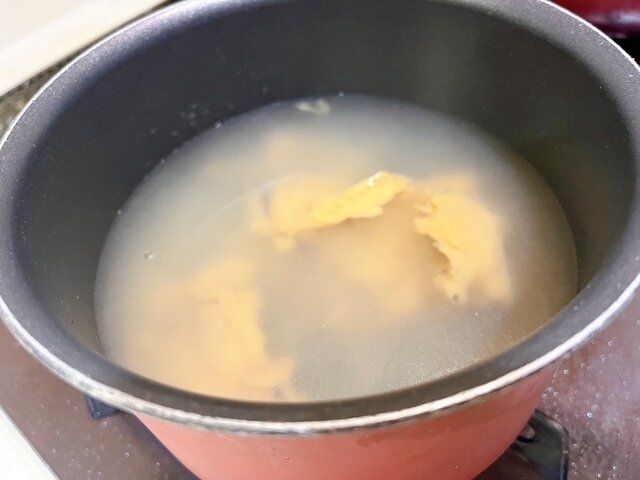 火にかけて、スープを溶かしながら混ぜていきます。最後に溶き卵を加えればできあがり。
