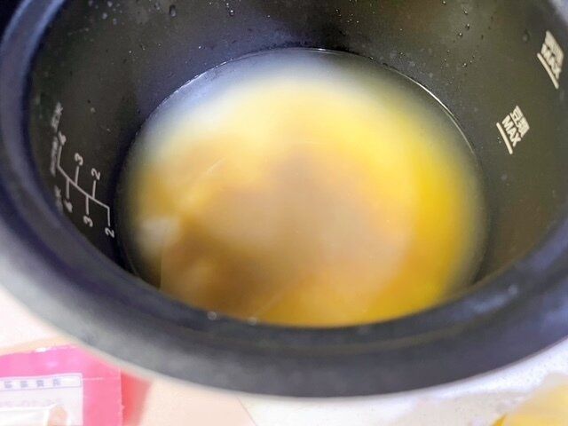 米は軽く洗って、水200mlといっしょに炊飯器にセットし、そこへ炊き込みごはん用のたれを入れます。