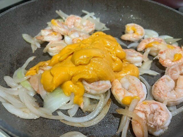 スライスした玉ねぎと背わたをとって殻をむいた海老をフライパンで炒めます。