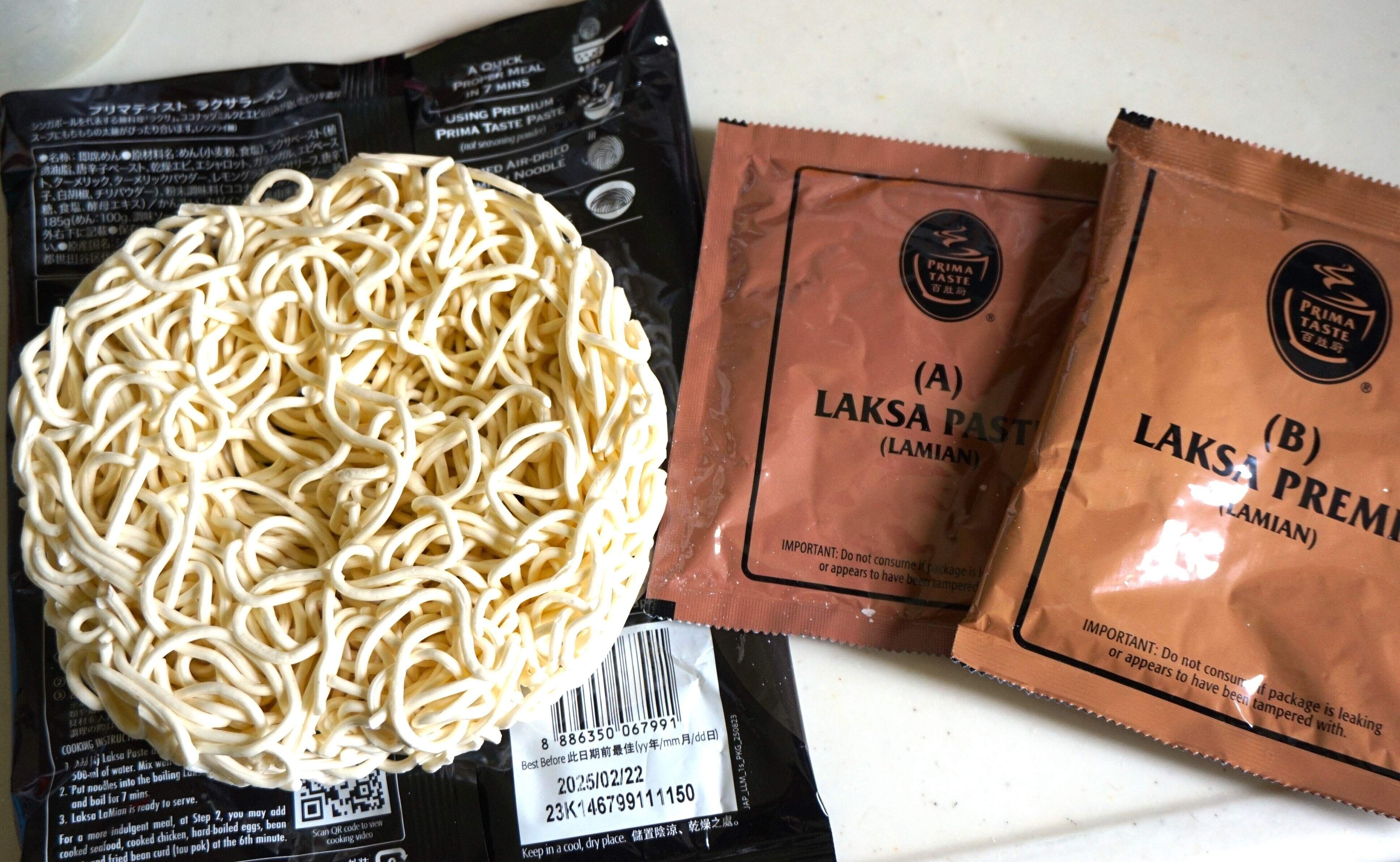 封を開けると2種類の袋と麺が入っています。袋のうち1つはラクサペースト(Aと書かれているほう)、もう1つはココナッツミルクの粉(Bと書かれているほう)になっています。