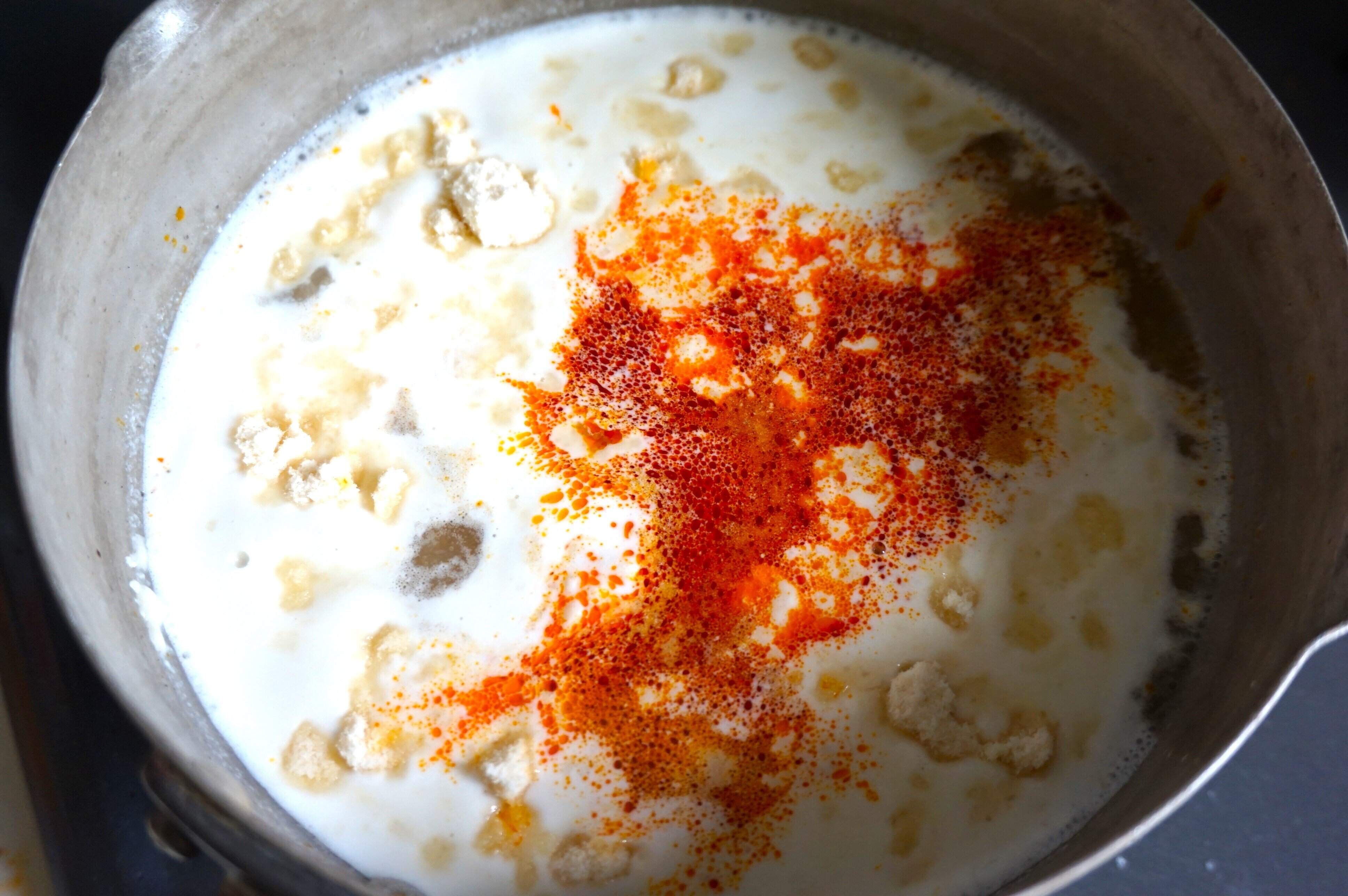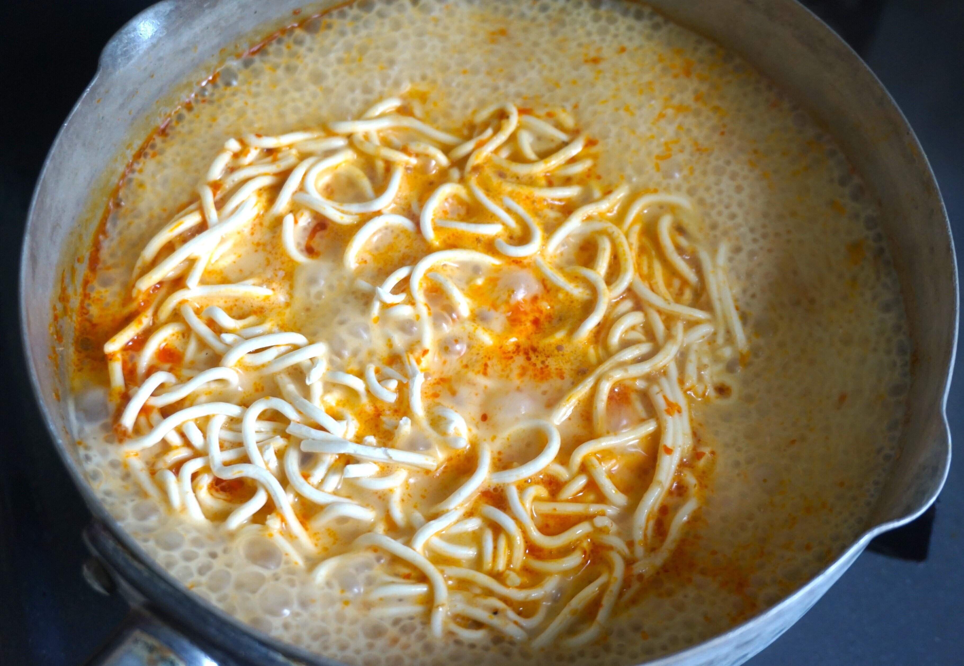 鍋にお湯を沸かしたら、ココナッツミルクとラクサペーストをお湯に溶かし、麺を入れて7分ゆでます。日本のラーメンと違うのは、スープで煮込むところです。すると、麺にスープがしみてとってもおいしくなりますよ。