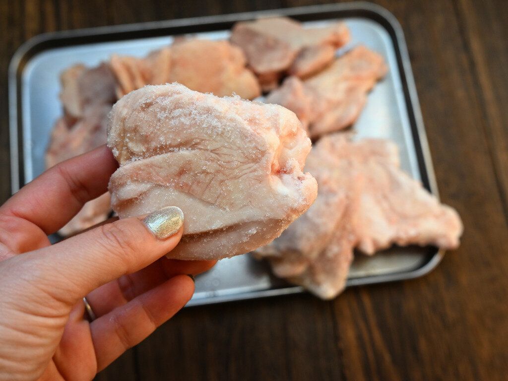 「若鶏ももブツ切り」は、最初から一口サイズにカットされているので、解凍してすぐに使えます。