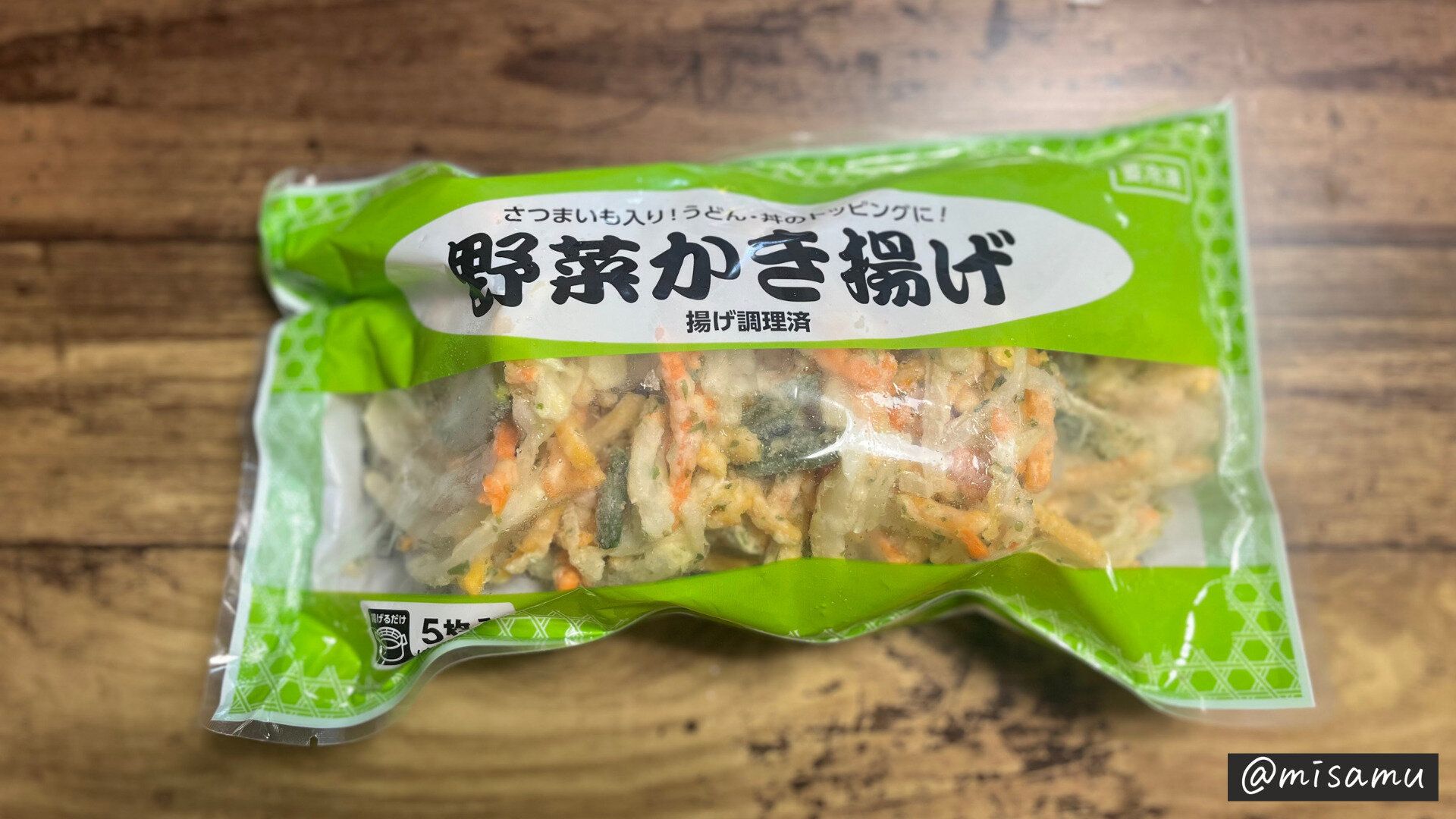 野菜かき揚げは、タマネギ、ニンジン、サツマイモ、インゲンなどの野菜本来の甘みがぎゅっと詰まった一品。青さのり入りの衣で包まれたサクサクの食感がたまりません。冷凍なので、必要な分だけ取り出して調理できる手軽さもうれしいポイントです。