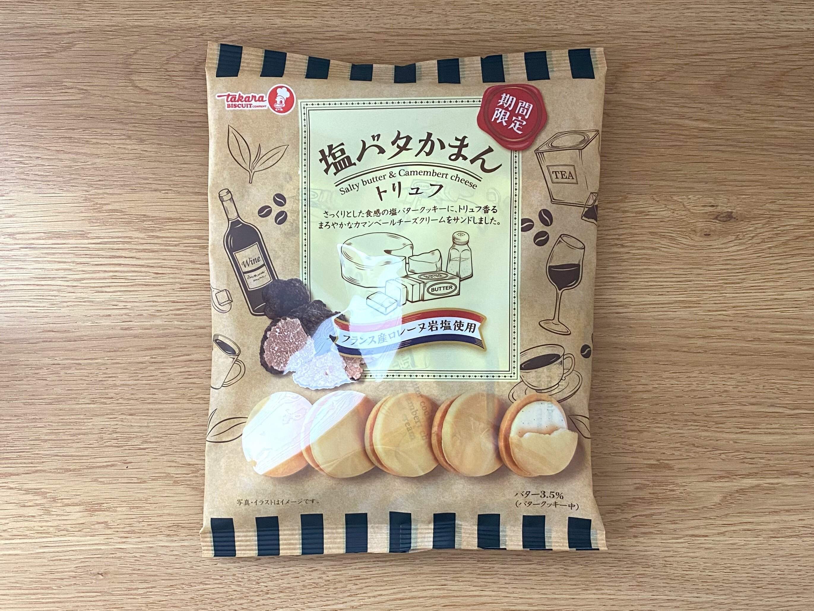 宝製菓の「塩バタかまん」から期間限定で登場した「塩バタかまんトリュフ」。サックリ軽やかな食感の塩バタークッキーで、芳醇なトリュフの香りをプラスしたカマンベールチーズクリームをサンドした贅沢な味わいのクッキーです。