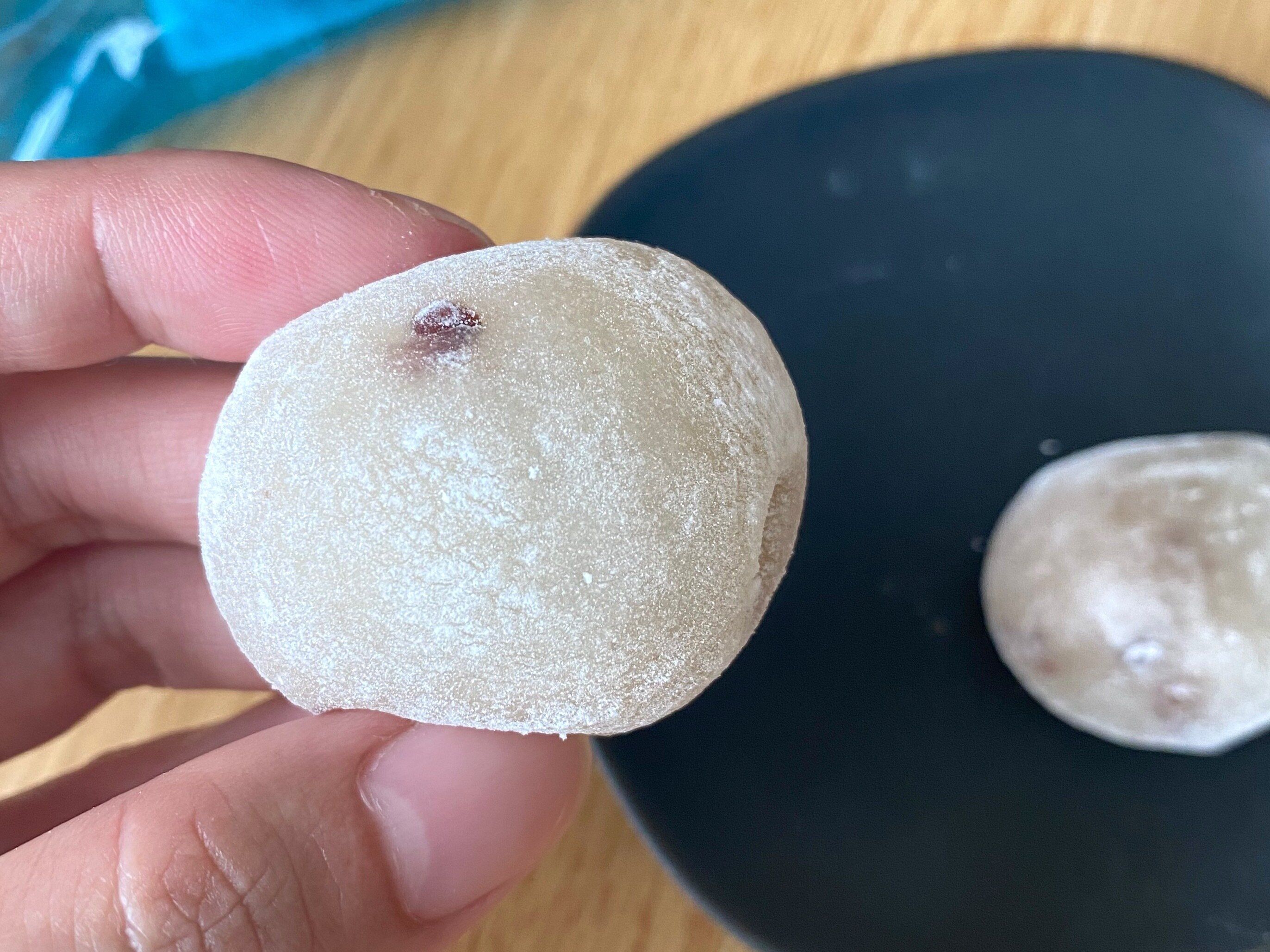 一口で食べるには少し大きめのサイズで、しっかりと弾力のあるもっちり食感の大福です。口に入るとまずぬちまーすの塩気を感じ、あとを追って餅やこし餡の甘さがやってきます。餡は少なめで塩豆餅が主役という印象。