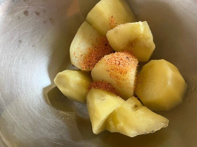 ゆでたやわらかくしたじゃがいもにこちらの「博多辛子めんたい粉」をふりかけて