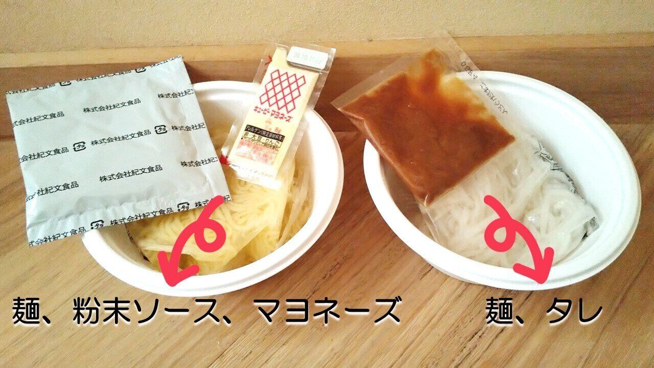 「ソース焼そば風」には麺、粉末ソース(かやく入り)、マヨネーズが入っていて、「ごまだれぶっかけうどん風」は麺とタレがセットになっていました。