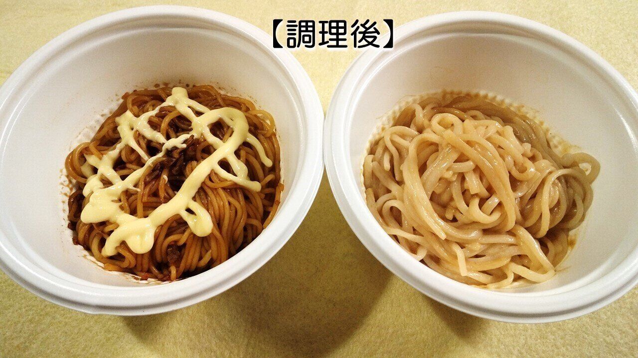 「ソース焼そば風」については、ラップをかけずに容器に入れたまま電子レンジで温め、マヨネーズをのせたら完成です。