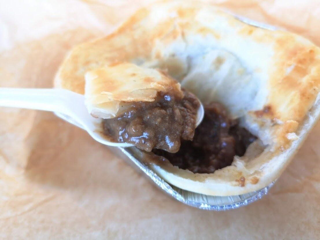 とろみの付いたひき肉のフィリングをパイで包み込んで焼き上げられていて、パイをザクザクっと崩しながら、一緒にいただく商品です。