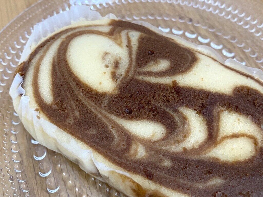 お皿に移そうと持ち上げただけで伝わるしっとり感。香りはチーズがほんのり香る程度で、この時点ではまだコーヒーの存在感はありません。マーブル状に混ざり合う生地がなんとも食欲をそそります。