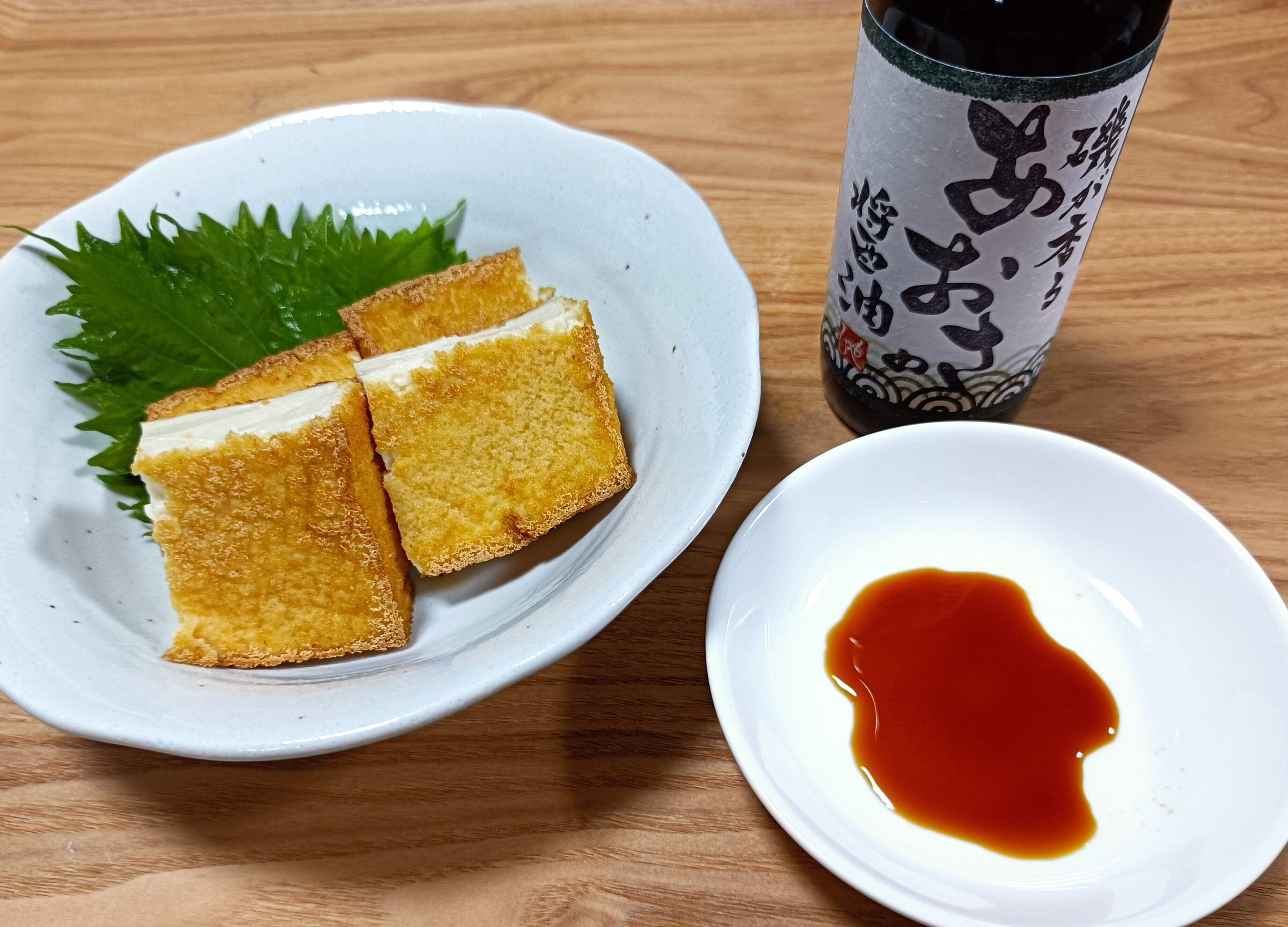 厚揚げはただ焼いただけですが、「磯が香る あおさの醤油」をつけるだけで一気にうまさがUPします。普通のお醤油をつけるより楽しめます。