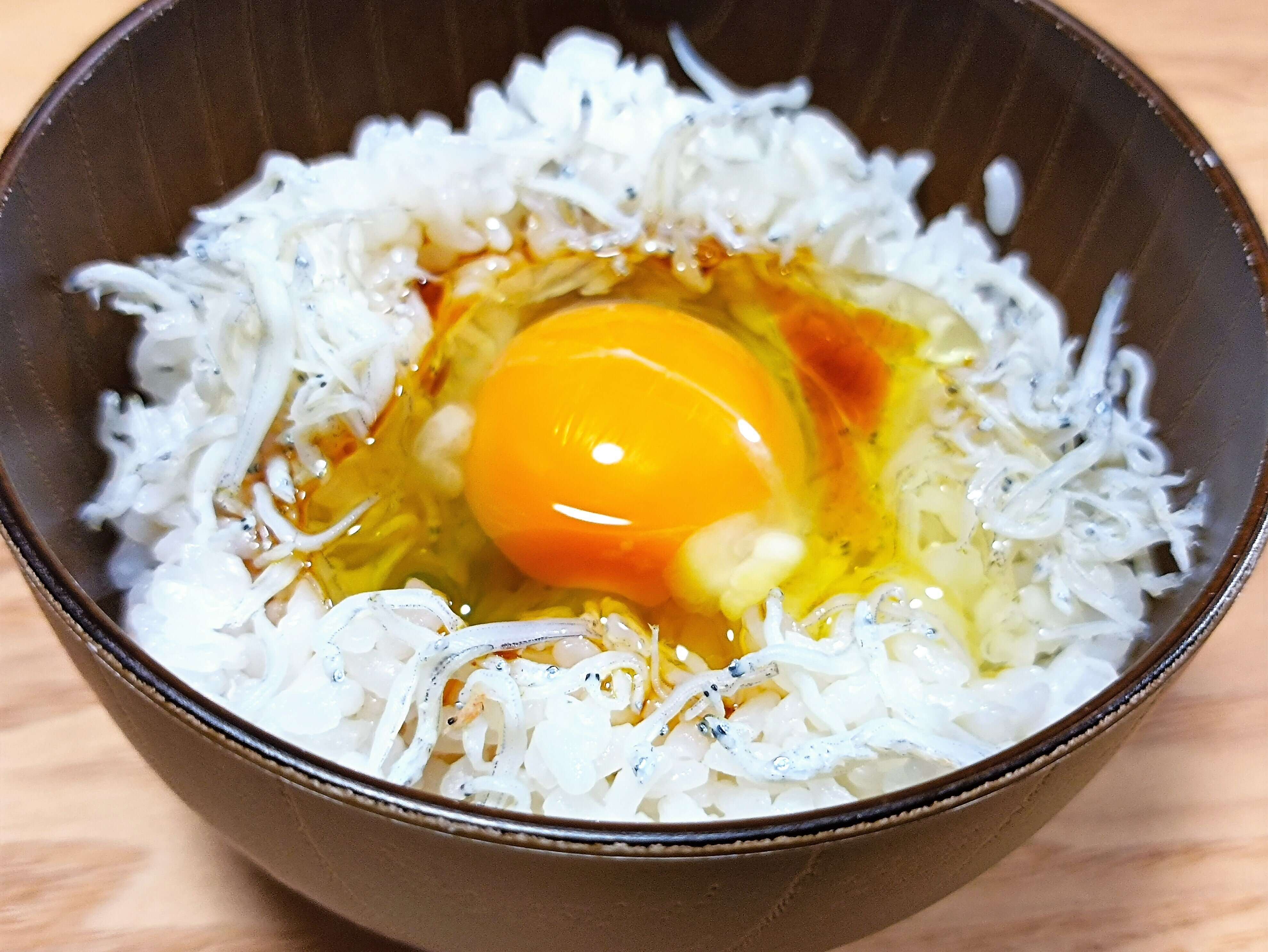 熱々ご飯にしらすをかけ、生卵を入れます。