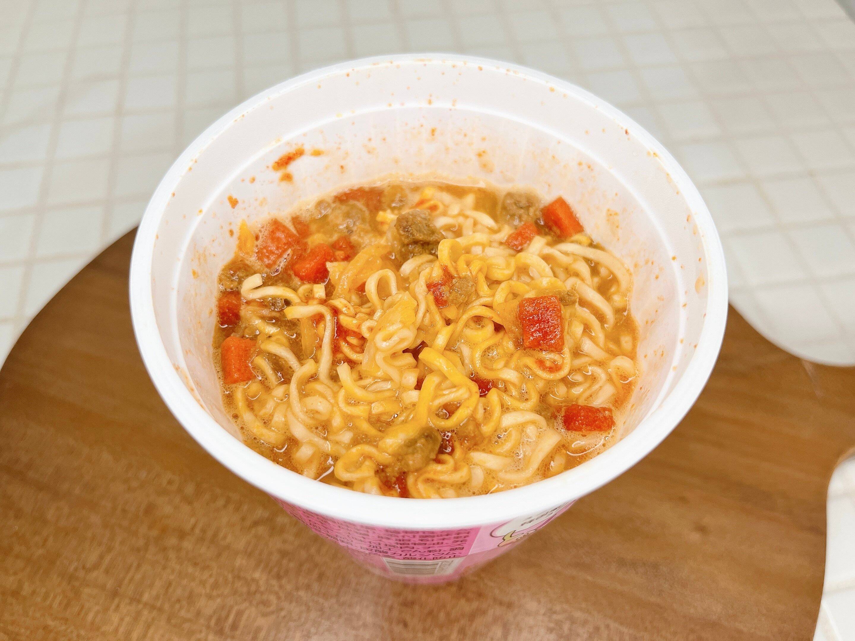 ピンクの可愛いパッケージの蓋を開けるとトマト系のインスタント麺の香りがします。コロコロ見える具は、ひき肉、チーズ、玉ねぎ、トマトの4種類です。