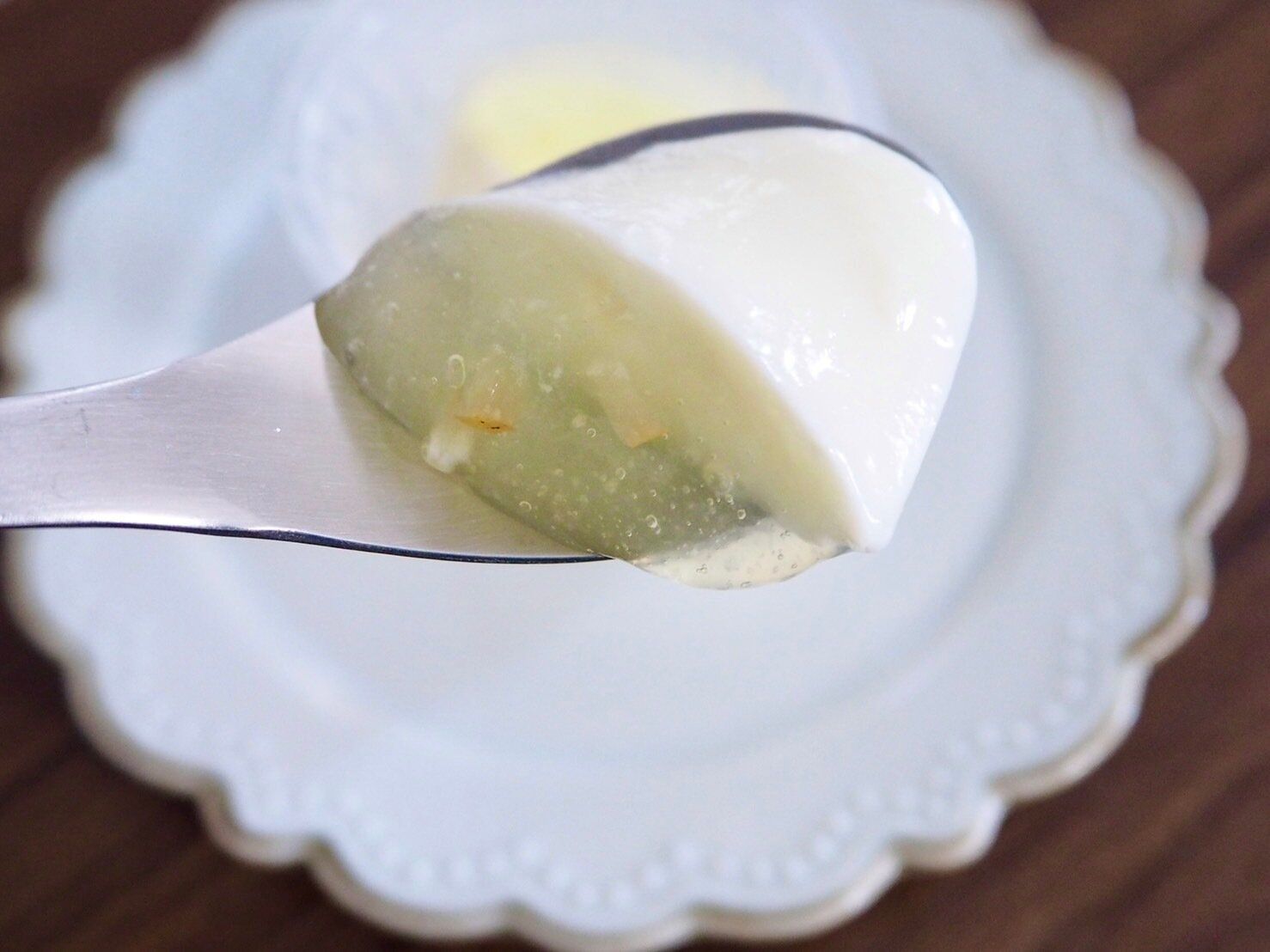 このコンポートがとろとろとミルクプリンによく絡み、ミルクプリンとレモンを同時に楽しむことができます。コンポートの中のレモン果皮が食感のアクセントに。