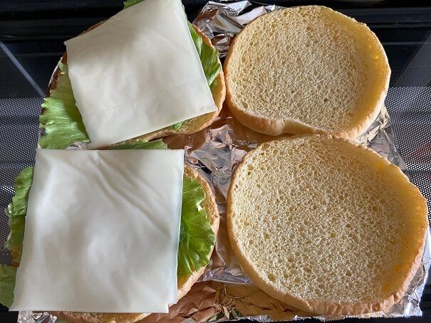 バンズにマヨネーズ、レタス、スライスチーズをのせて