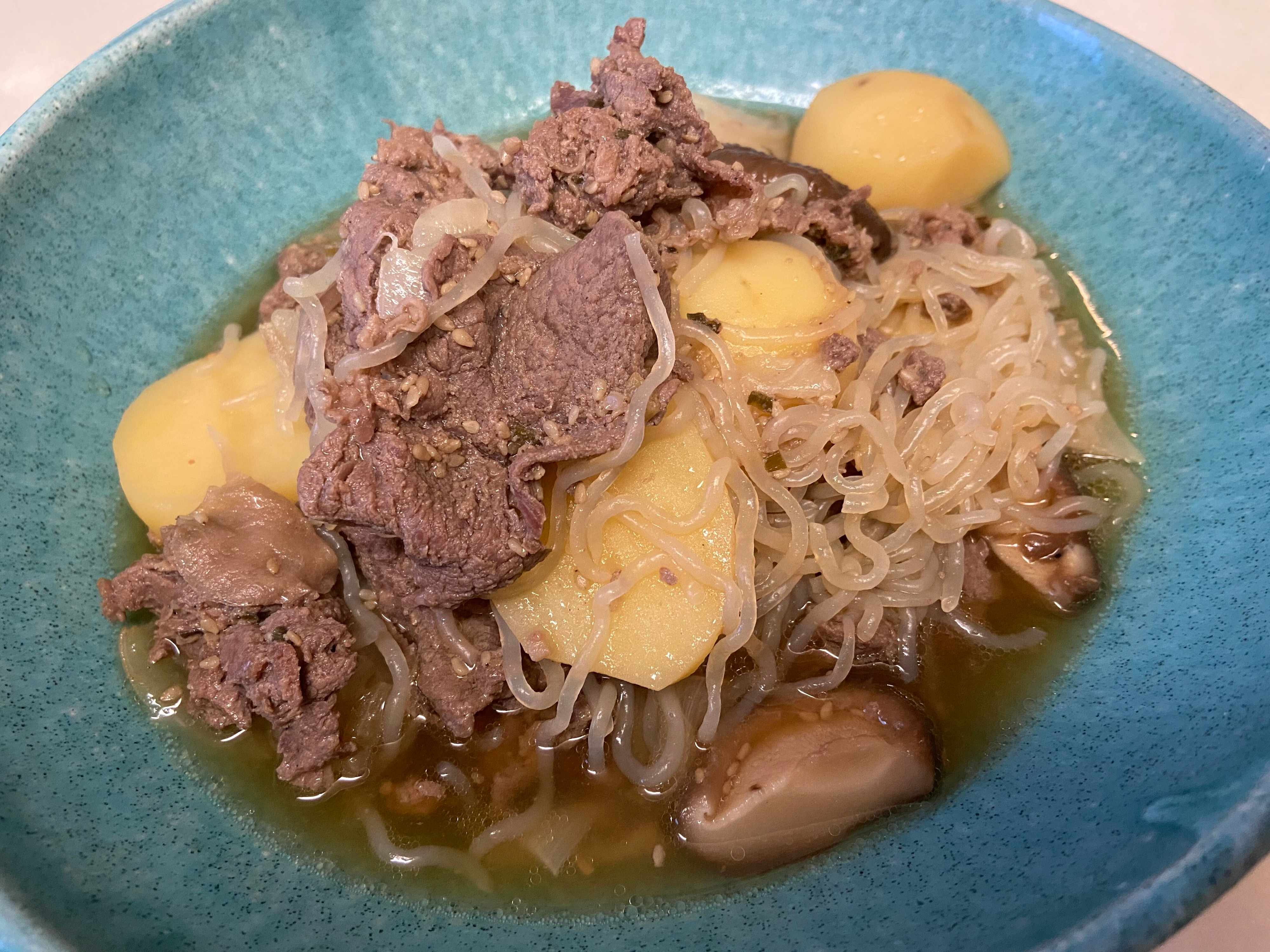 プルコギを炒めてカットしたじゃがいも、玉ねぎ、白滝やきのこ、だし汁を加えてコトコト煮るだけで完成!味を見て薄いようならお醤油を足してみてください。