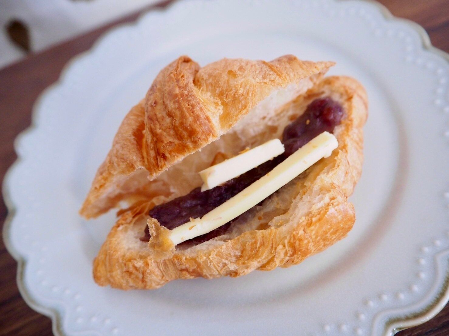 クロワッサンの真ん中には切れ目が入っており、中には棒状のバターと粒餡が入っています。