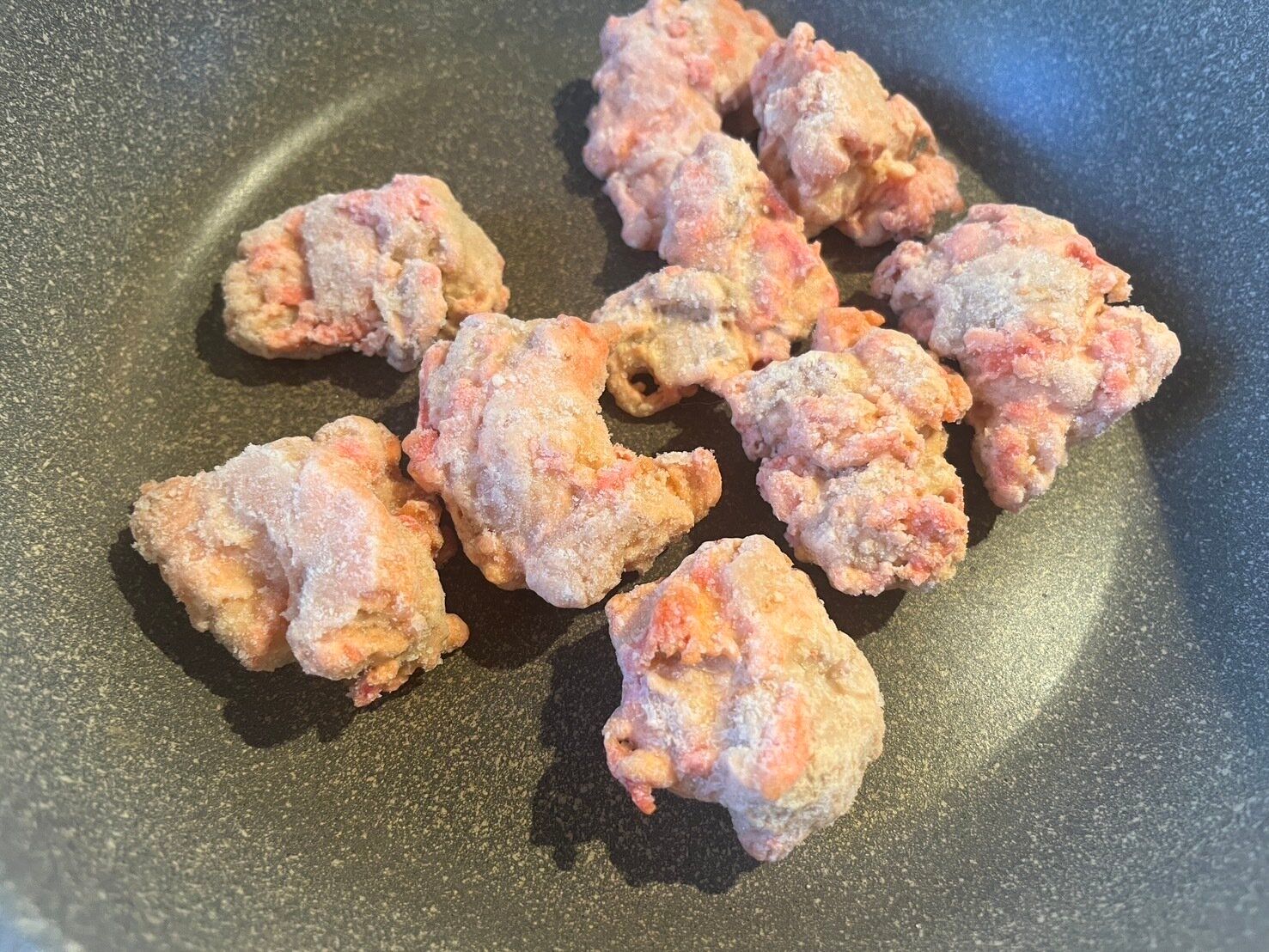 フライパンに少量の油を引いて、凍ったままのからあげを入れて揚げ焼きしていきます。