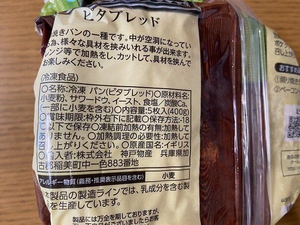 業務スーパーの冷凍コーナーにおいてあるピタブレッド(購入時価格:298円)はイギリスから輸入されている本格派の平たい円形状のパンです。