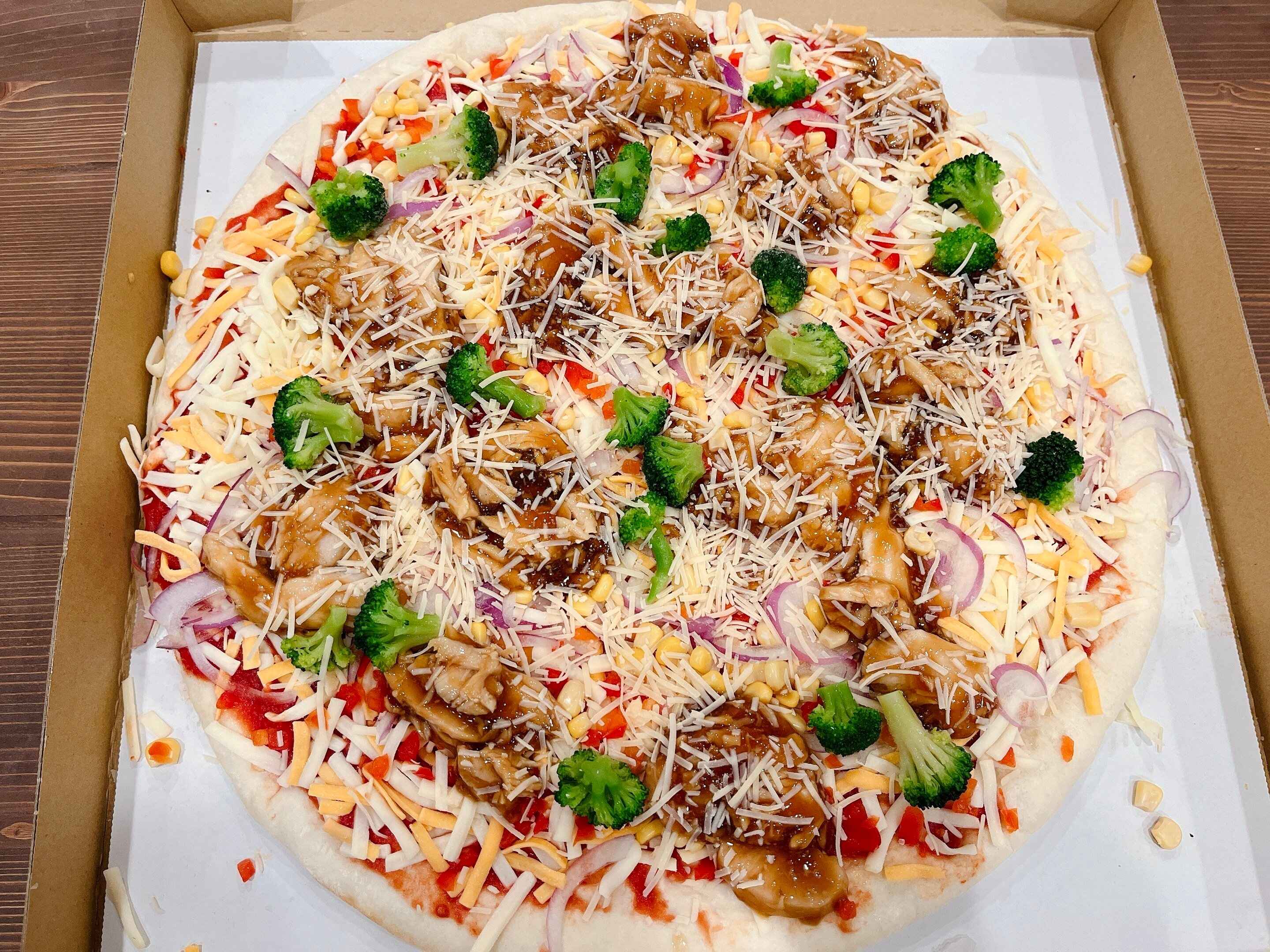 3種類のチーズ、照り焼きチキン、コーン、パプリカ、紫玉ねぎ、ブロッコリーとたくさんの具がのっていてボリューム満点のピザです。彩りが綺麗な点もポイント高いです。