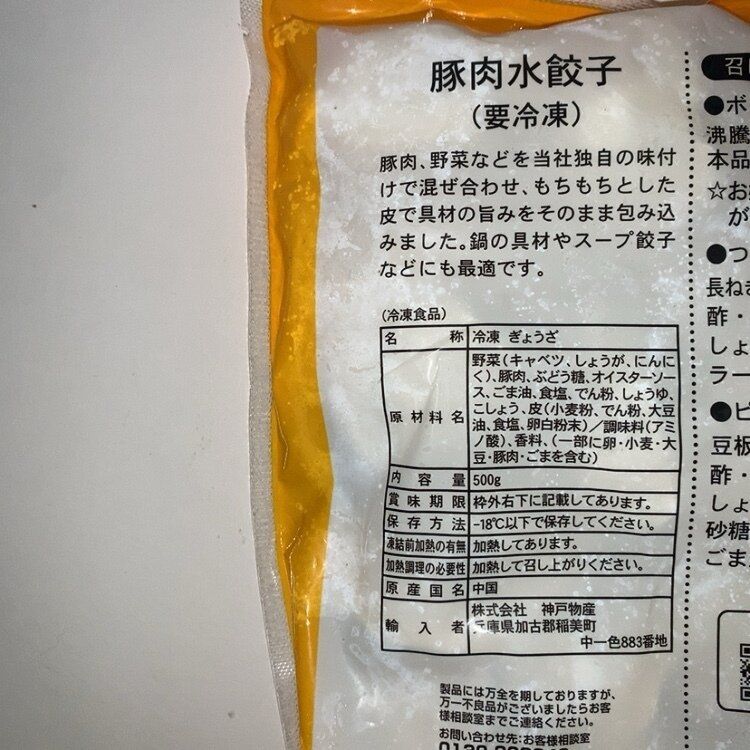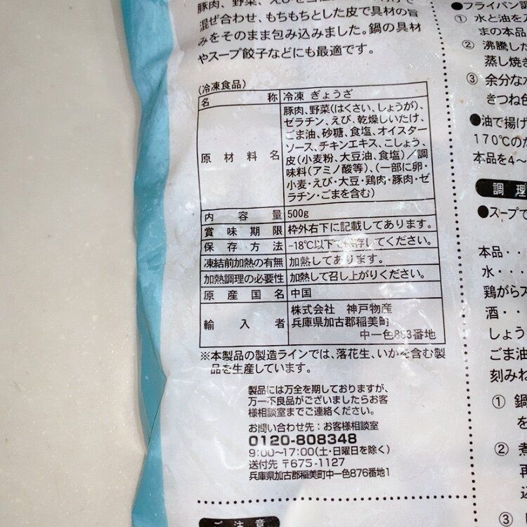 原材料名:野菜(キャベツ、しょうが、にんにく)、豚肉、ぶどう糖、オイスターソース、ごま油、食塩、でん粉、しょうゆ、こしょう、皮(小麦粉、でん粉、大豆油、食塩、卵白粉末)/調味料(アミノ酸)、香料、(一部に卵・小麦・大豆・豚肉・ごまを含む)