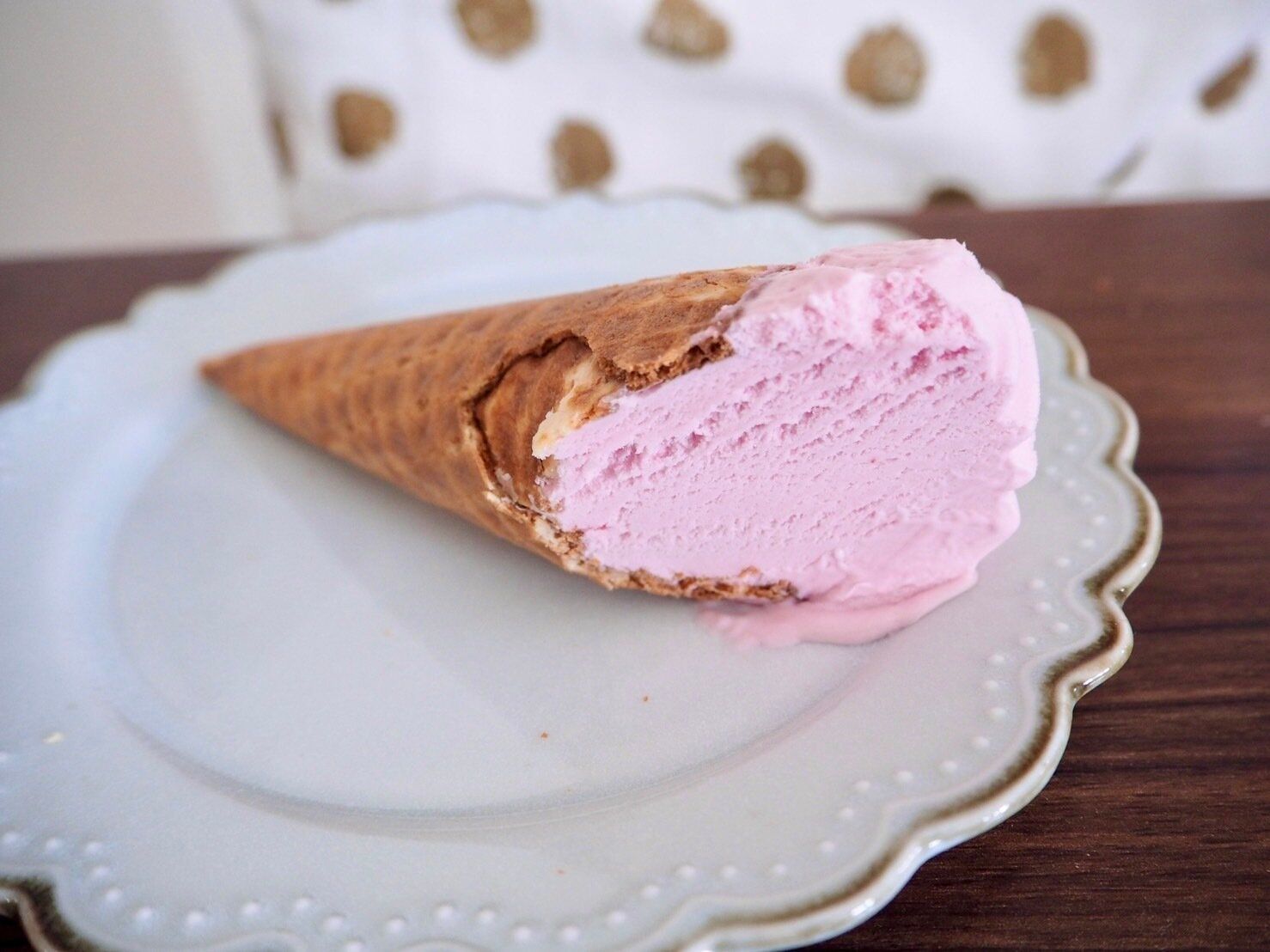 早速パッケージをあけてみると、淡いピンク色のアイス、こんがり色のシュガーコーンからは食べる前でも香ばしいかおりがします。
