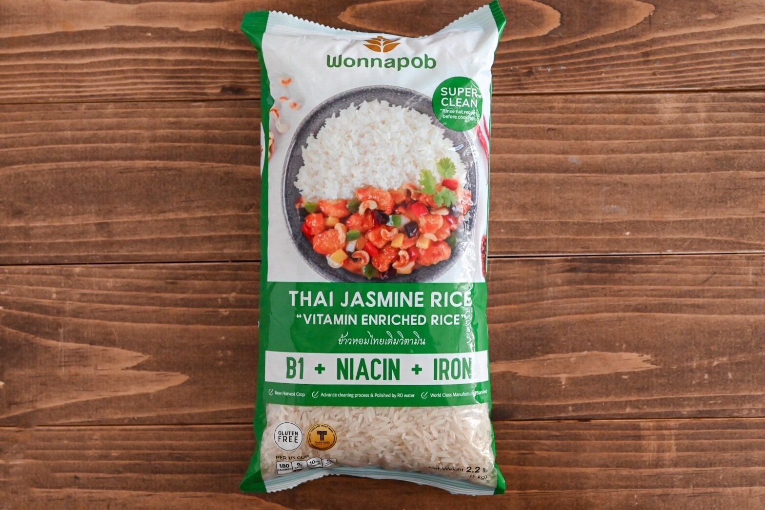 ジャスミンライスとはジャスミンの花のように白い見た目のタイの米で、上品な甘さが特徴で、日本の米と比べると細長い形をしています。