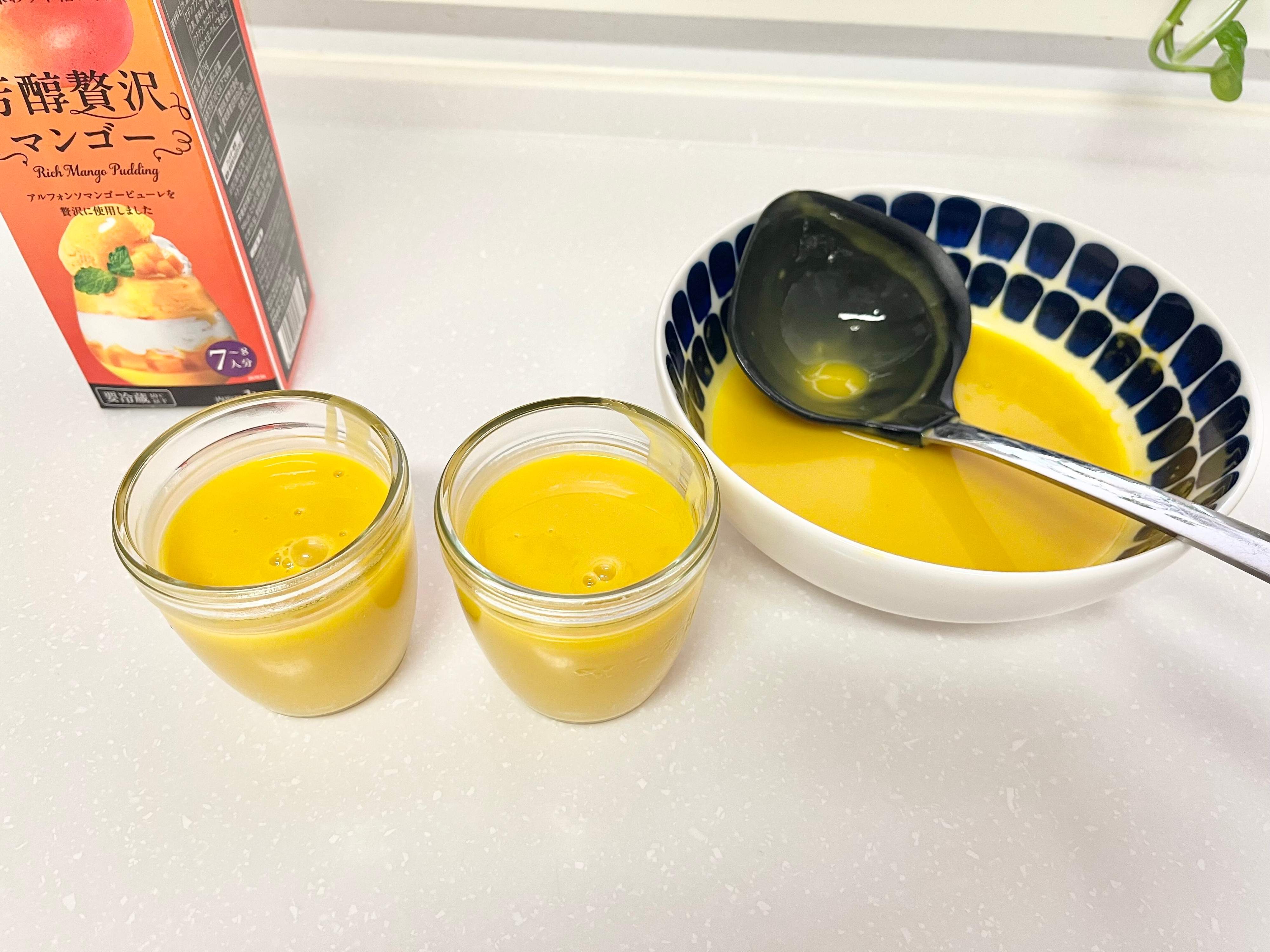 くずれてしまうと少しテンションが下がってしまいますが、そんなときはお気に入りの器でマンゴープリンをつくり直してみましょう!レシピはパッケージに記載されているものを、参考にさせていただきました。