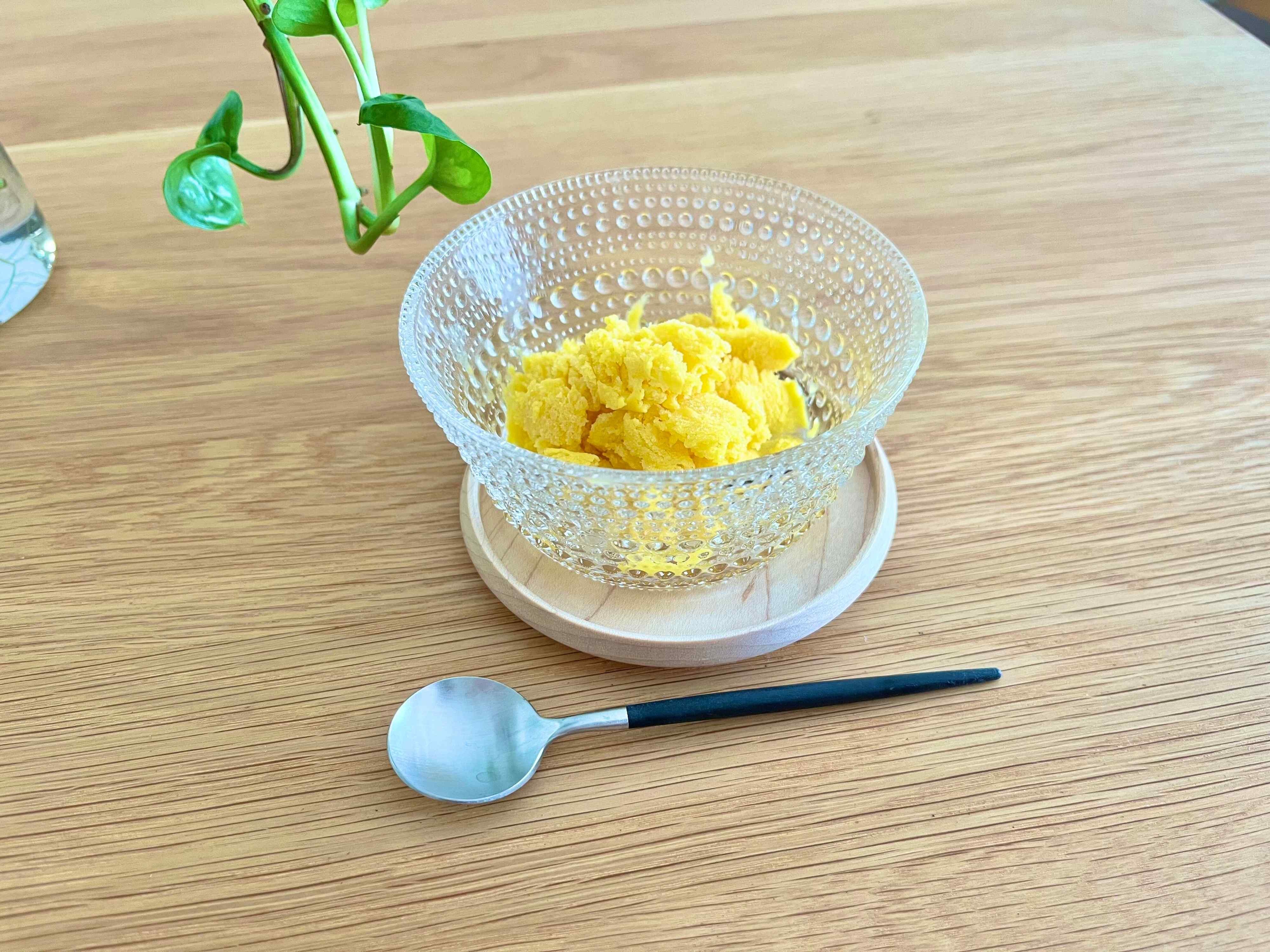 こちらは溶かさずに泡立て器でしっかり混ぜてから、バットなどに入れて冷凍庫で冷やし固めるだけで完成!シャリシャリ食感のシャーベットのようになるので、暑い日にピッタリですよ。