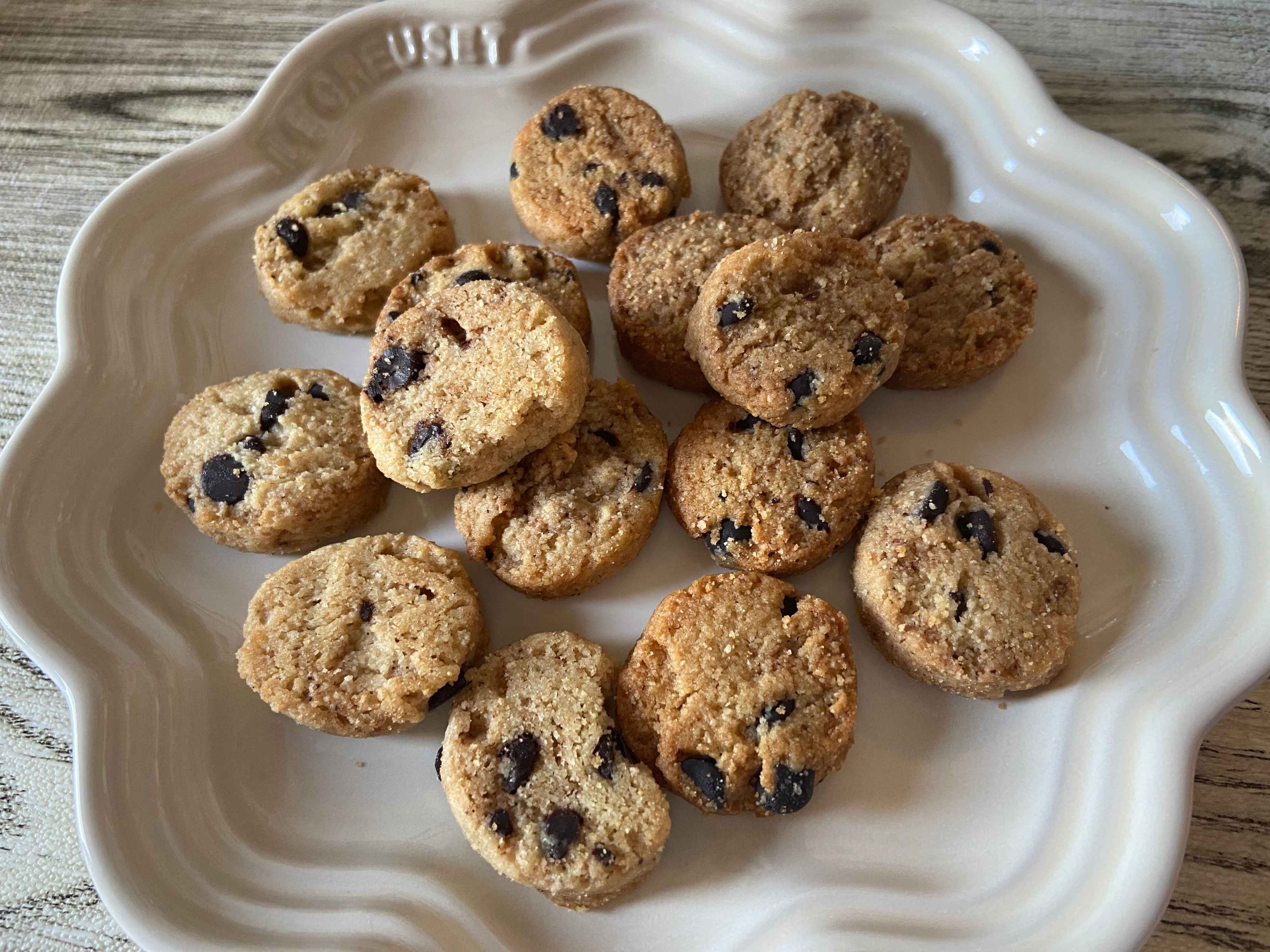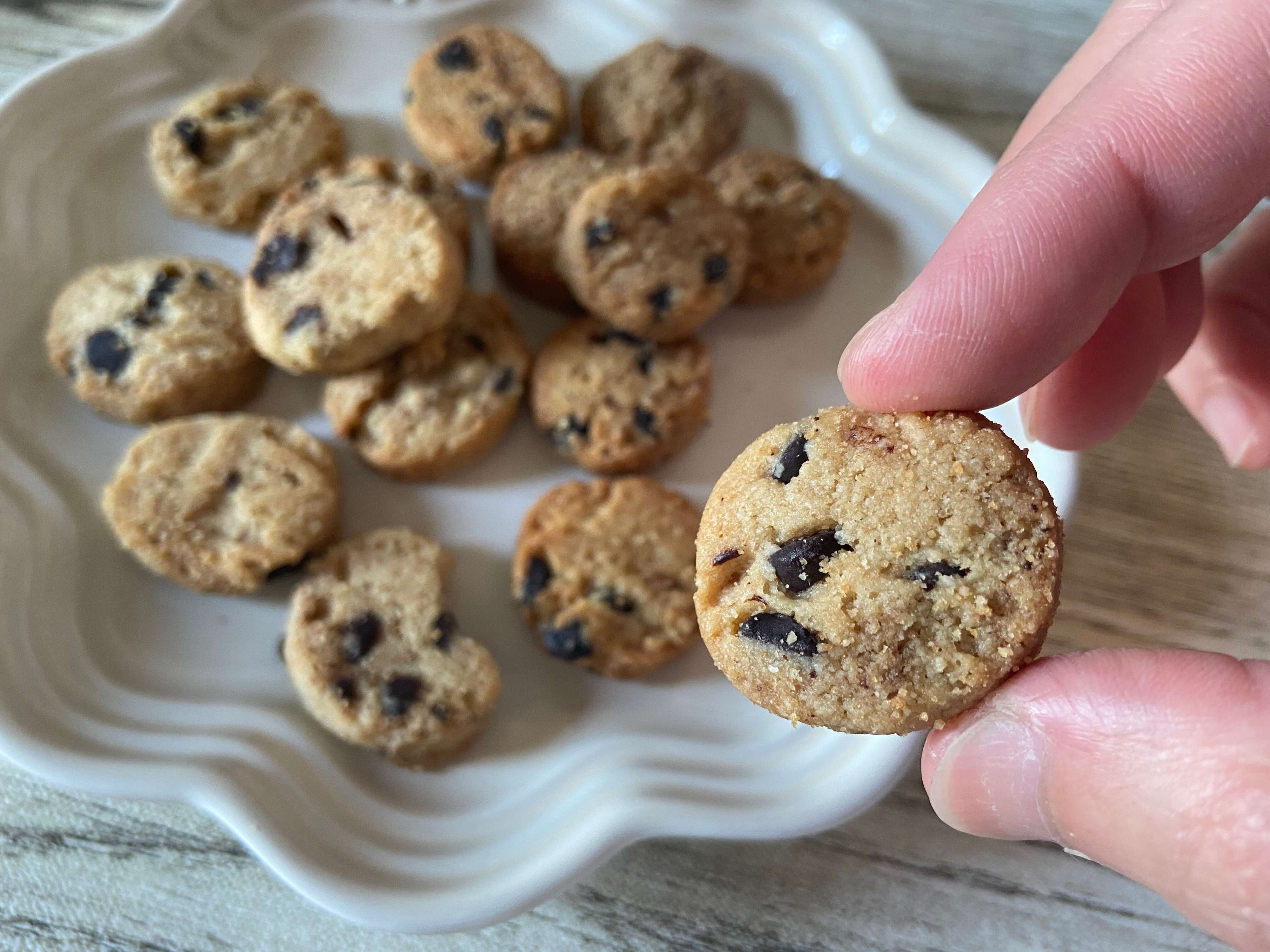 甘さは控えめで、小麦粉が入っていないのでサクサク食感はありませんがしっとりとしたソフトタイプのクッキーで食べやすいです。アーモンド粉がメインなのでナッツの風味もあって、たっぷり入ったチョコチップはビターテイストなので甘すぎずおいしい。